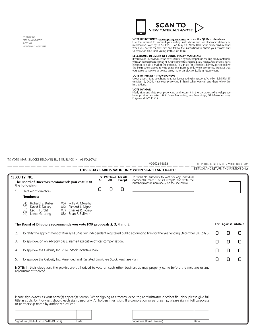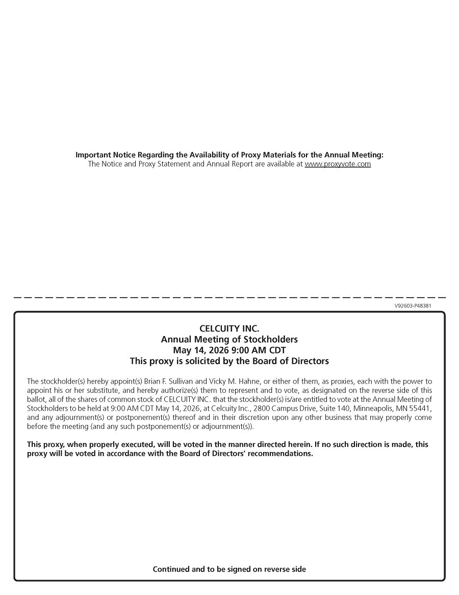 Please Take Notice that Celcuity Inc. (“Celcuity”) will hold its 2026 Annual Meeting of Stockholders (the “Annual Meeting”) at the offices of Celcuity Inc., 2800 Campus Drive, Suite 140, Minneapolis, MN 55441, on May 14, 2026, at 9:00 a.m. local time. Celcuity is holding this meeting for the purpose of considering and taking appropriate action with respect to the following: