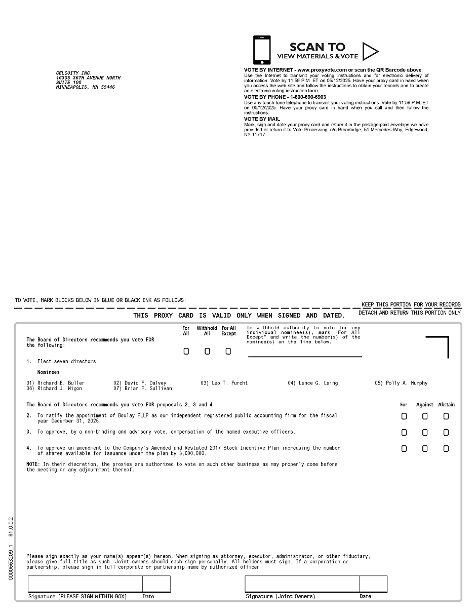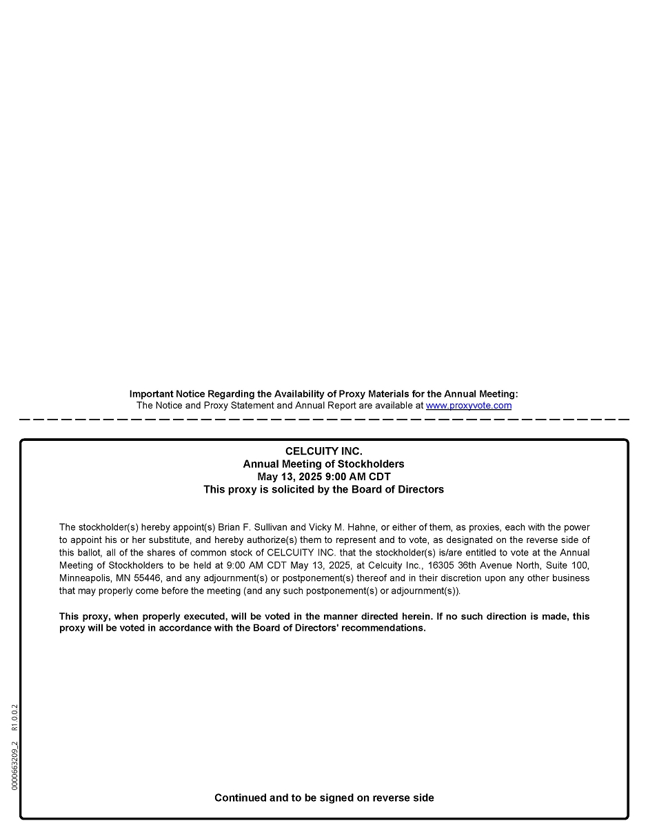 Please Take Notice that Celcuity Inc. (“Celcuity”) will hold its 2025 Annual Meeting of Stockholders at the offices of Celcuity Inc., 16305 36th Avenue North, Suite 100, Minneapolis, MN 55446, on May 13, 2025 at 9:00 a.m. local time. Celcuity is holding this meeting for the purpose of considering and taking appropriate action with respect to the following: