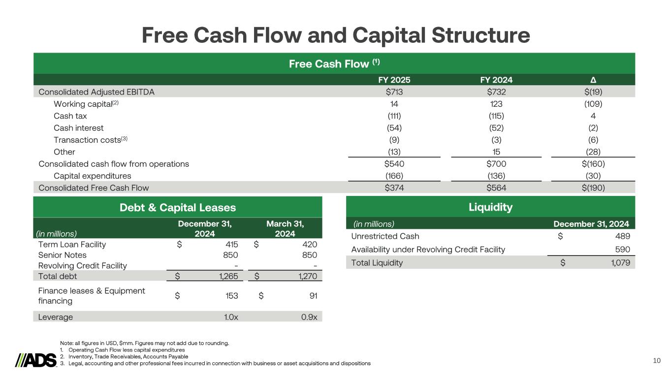 Reconciliations 16 (In thousands) Net Sales Intersegment Net Sales Net Sales from External Customers Net Sales Intersegment Net Sales Net Sales from External Customers Pipe $ 356,010 $ (12,607) $ 343,403 $ 360,733 $ (11,629) $ 349,104 Infiltrator Water Technologies 152,384 (17,083) 135,301 131,144 (27,273) 103,871 International International - Pipe 36,909 (2,860) 34,049 44,203 (5,420) 38,783 International - Allied Products & Other 16,372 (58) 16,314 14,166 (1) 14,165 Total International 53,281 (2,918) 50,363 58,369 (5,421) 52,948 Allied Products & Other 165,233 (3,762) 161,471 159,162 (2,718) 156,444 Intersegment Eliminations (36,370) 36,370 - (47,041) 47,041 - Total Consolidated $ 690,538 $ - $ 690,538 $ 662,367 $ - $ 662,367 (In thousands) Net Sales Intersegment Net Sales Net Sales from External Customers Net Sales Intersegment Net Sales Net Sales from External Customers Pipe $ 1,227,288 $ (41,972) $ 1,185,316 $ 1,217,302 $ (31,672) $ 1,185,630 Infiltrator Water Technologies 456,104 (62,093) 394,011 406,361 (63,405) 342,956 International International - Pipe 125,281 (10,150) 115,131 133,787 (9,219) 124,568 International - Allied Products & Other 49,664 (174) 49,490 46,789 (27) 46,762 Total International 174,945 (10,324) 164,621 180,576 (9,246) 171,330 Allied Products & Other 556,920 (12,384) 544,536 528,303 (7,586) 520,717 Intersegment Eliminations (126,773) 126,773 - (111,909) 111,909 - Total Consolidated $ 2,288,484 $ - $ 2,288,484 $ 2,220,633 $ - $ 2,220,633 Three Months Ended December 31, 2024 December 31, 2023 Nine Months Ended December 31, 2024 December 31, 2023