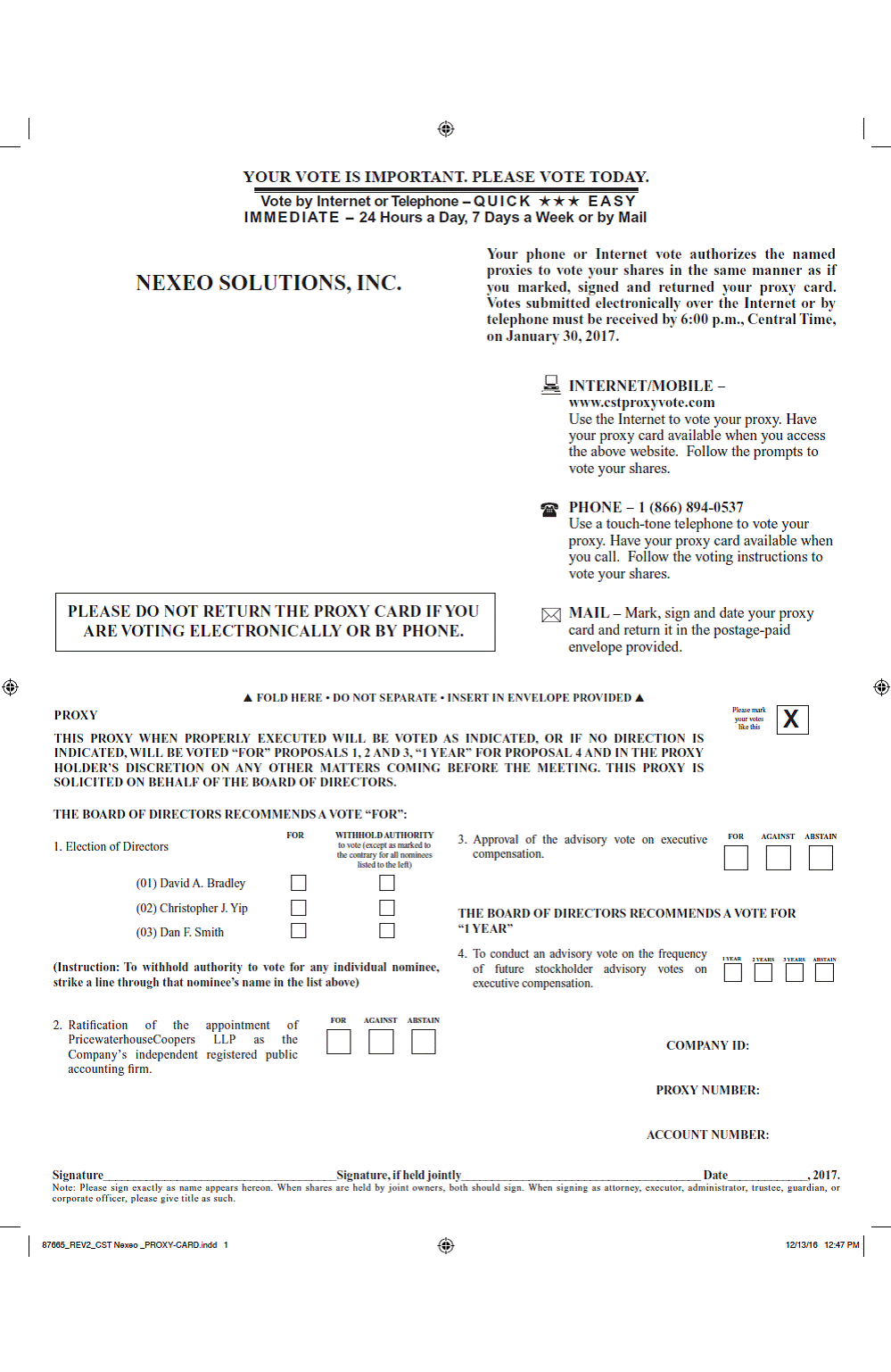 YOUR VOTE IS IMPORTANT. PLEASE VOTE TODAY. Vote by Internet or Telephone - Q UICK EASY IMMEDI ATE - 24 Hours a Day, 7 Days a Week or by Mail Your phone or Internet vote authorizes the named proxies to vote your shares in the same manner as if you marked, signed and returned your proxy card. Votes submitted electronically over the Internet or by telephone must be received by 6:00 p.m., Central Time, on January 30, 2017. NEXEO SOLUTIONS, INC. INTERNET/MOBILE – www.cstproxyvote.com Use the Internet to vote your proxy. Have your proxy card available when you access the above website. Follow the prompts to vote your shares. PHONE – 1 (866) 894-0537 Use a touch-tone telephone to vote your proxy. Have your proxy card available when you call. Follow the voting instructions to vote your shares. MAIL – Mark, sign and date your proxy card and return it in the postage-paid envelope provided. FOLD HERE • DO NOT SEPARATE • INSERT IN ENVELOPE PROVIDED Please mark your votes like this PROXY THIS PROXY WHEN PROPERLY EXECUTED WILL BE VOTED AS INDICATED, OR IF NO DIRECTION IS INDICATED, WILL BE VOTED “FOR” PROPOSALS 1, 2 AND 3, “1 YEAR” FOR PROPOSAL 4 AND IN THE PROXY HOLDER’S DISCRETION ON ANY OTHER MATTERS COMING BEFORE THE MEETING. THIS PROXY IS SOLICITED ON BEHALF OF THE BOARD OF DIRECTORS. THE BOARD OF DIRECTORS RECOMMENDS A VOTE “FOR”: FOR WITHHOLD AUTHORITY to vote (except as marked to the contrary for all nominees listed to the left) 3. Approval of the advisory vote on executive compensation. FOR AGAINST ABSTAIN 1. Election of Directors (01) David A. Bradley (02) Christopher J. Yip (03) Dan F. Smith THE BOARD OF DIRECTORS RECOMMENDS A VOTE FOR “1 YEAR” 4. To conduct an advisory vote on the frequency of future stockholder advisory votes on executive compensation. 1 YEAR 2 YEARS 3 YEARS ABSTAIN (Instruction: To withhold authority to vote for any individual nominee, strike a line through that nominee’s name in the list above) FOR AGAINST ABSTAIN 2. Ratification of the appointmentof PricewaterhouseCoopers Company’s independent accounting firm. LLP as the COMPANY ID: registered public PROXY NUMBER: ACCOUNT NUMBER: Signature Signature, if held jointly Date , 2017. Note: Please sign exactly as name appears hereon. When shares are held by joint owners, both should sign. When signing as attor ney, executor, administrator, tr ustee, guardian, or cor porate off icer, please give title as such. 87665_REV2_CST Nexeo _PROXY-CARD.indd 1 12/13/16 12:47 PM X PLEASE DO NOT RETURN THE PROXY CARD IF YOU ARE VOTING ELECTRONICALLY OR BY PHONE.