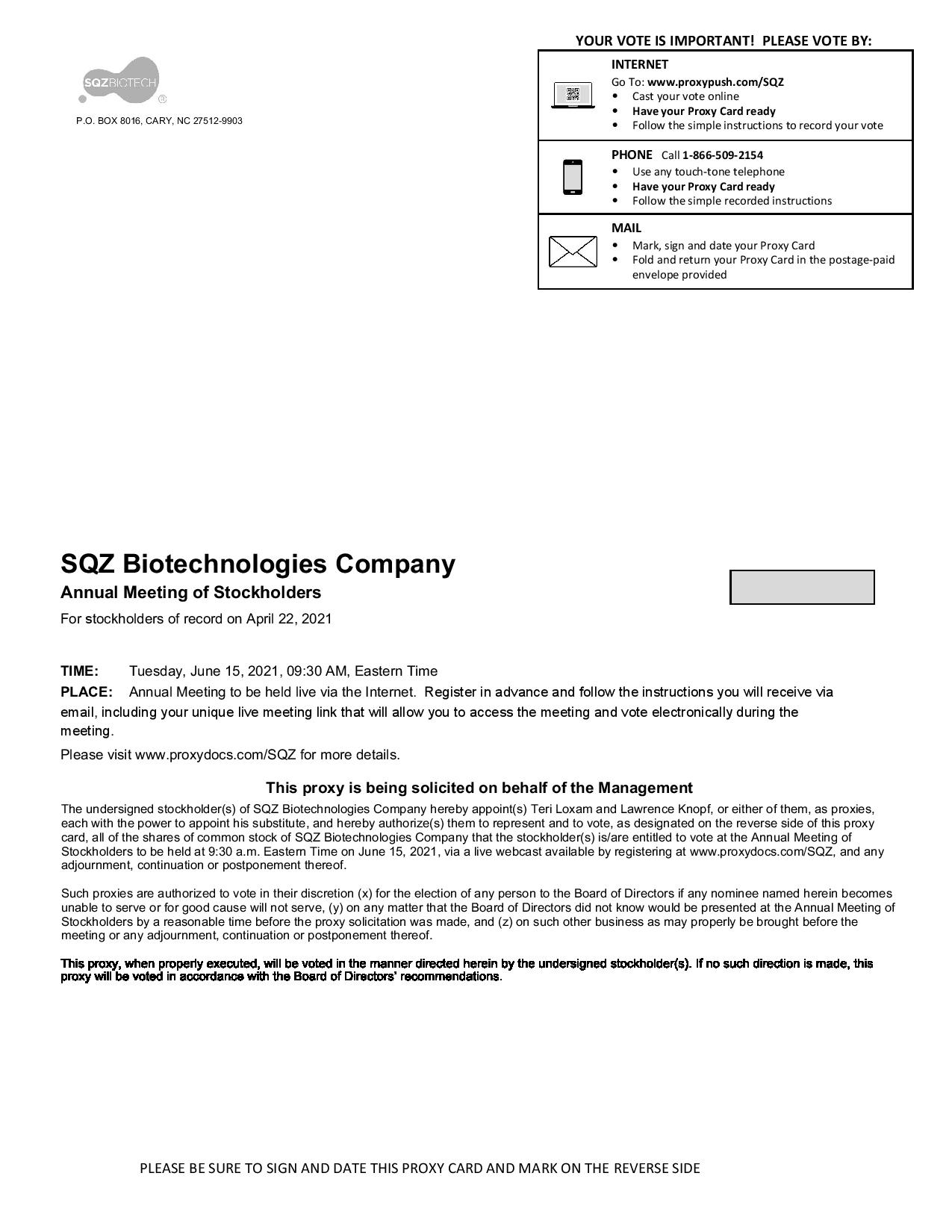 SQZBIOTECH ® P.O. BOX 8016, CARY, NC 27512-9903 YOUR VOTE IS IMPORTANT! PLEASE VOTE BY: INTERNET Go To: www.proxypush.com/SQZ • Cast your vote online • Have your Proxy Card ready • Follow the simple instructions to record your vote PHONE Call 1-866-509-2154 • Use any touch-tone telephone • Have your Proxy Card ready • Follow the simple recorded instructions MAIL • Mark, sign and date your Proxy Card • Fold and return your Proxy Card in the postage-paid envelope provided SQZ Biotechnologies Company Annual Meeting of Stockholders For stockholders of record on April 22, 2021 TIME: Tuesday, June 15, 2021, 09:30 AM, Eastern Time PLACE: Annual Meeting to be held live via the Internet. Register in advance and follow the instructions you will receive via email, including your unique live meeting link that will allow you to access the meeting and vote electronically during the meeting. Please visit www.proxydocs.com/SQZ for more details. This proxy is being solicited on behalf of the Management The undersigned stockholder(s) of SQZ Biotechnologies Company hereby appoint(s) Teri Loxam and Lawrence Knopf, or either of them, as proxies, each with the power to appoint his substitute, and hereby authorize(s) them to represent and to vote, as designated on the reverse side of this proxy card, all of the shares of common stock of SQZ Biotechnologies Company that the stockholder(s) is/are entitled to vote at the Annual Meeting of Stockholders to be held at 9:30 a.m. Eastern Time on June 15, 2021, via a live webcast available by registering at www.proxydocs.com/SQZ, and any adjournment, continuation or postponement thereof. Such proxies are authorized to vote in their discretion (x) for the election of any person to the Board of Directors if any nominee named herein becomes unable to serve or for good cause will not serve, (y) on any matter that the Board of Directors did not know would be presented at the Annual Meeting of Stockholders by a reasonable time before the proxy solicitation was made, and (z) on such other business as may properly be brought before the meeting or any adjournment, continuation or postponement thereof. This proxy, when properly executed, will be voted in the manner directed herein by the undersigned stockholder(s). If no such direction is made, this proxy will be voted in accordance with the Board of Directors’ recommendations. PLEASE BE SURE TO SIGN AND DATE THIS PROXY CARD AND MARK ON THE REVERSE SIDE