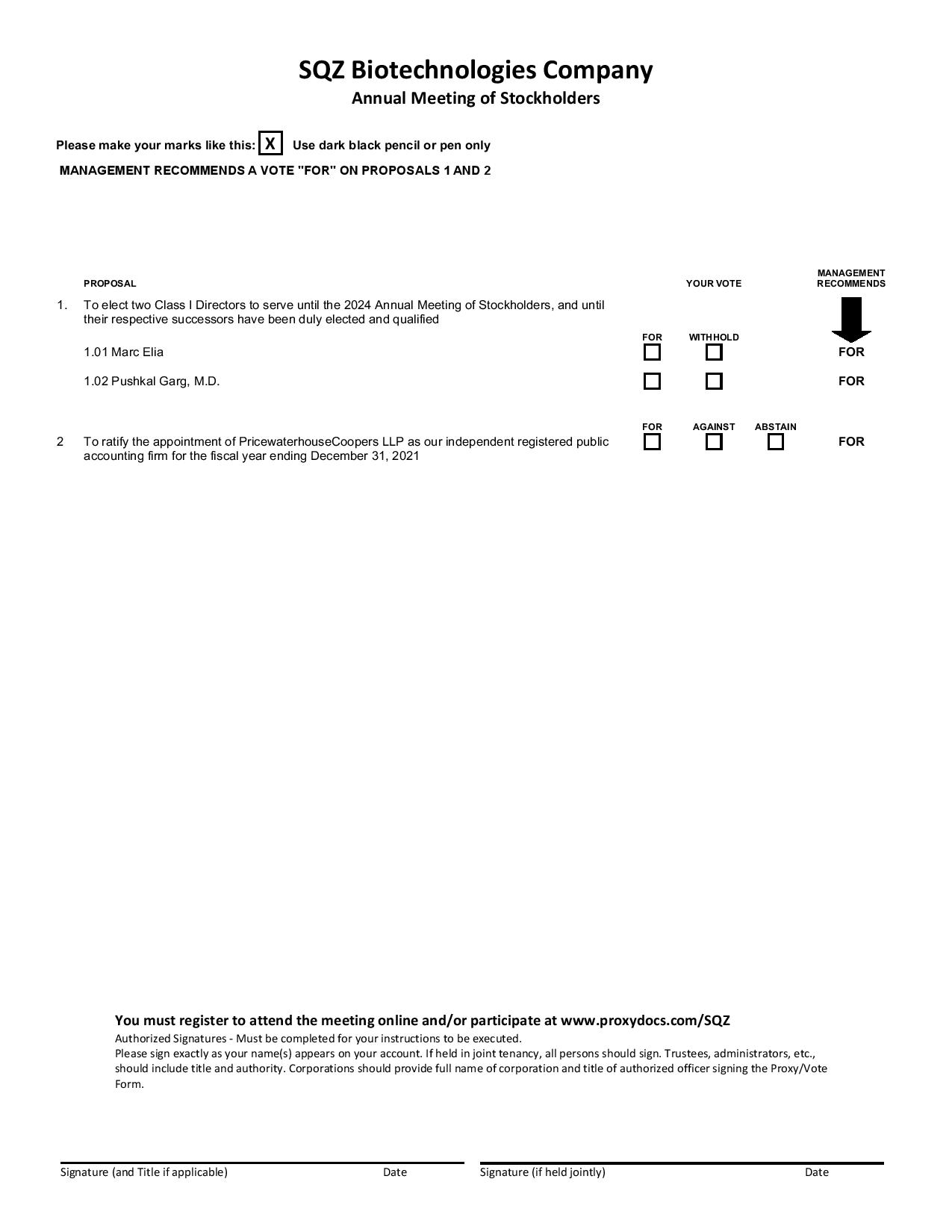 SQZ Biotechnologies Company Annual Meeting of Stockholders Please make your marks like this: X Use dark black pencil or pen only MANAGEMENT RECOMMENDS A VOTE "FOR" ON PROPOSALS 1 AND 2 PROPOSAL YOUR VOTE MANAGEMENT RECOMMENDS 1. To elect two Class I Directors to serve until the 2024 Annual Meeting of Stockholders, and until their respective successors have been duly elected and qualified FOR WITHHOLD 1.01 Marc Elia FOR 1.02 Pushkal Garg, M.D. FOR 2 To ratify the appointment of PricewaterhouseCoopers LLP as our independent registered public accounting firm for the fiscal year ending December 31, 2021 FOR AGAINST ABSTAIN FOR You must register to attend the meeting online and/or participate at www.proxydocs.com/SQZ Authorized Signatures - Must be completed for your instructions to be executed. Please sign exactly as your name(s) appears on your account. If held in joint tenancy, all persons should sign. Trustees, administrators, etc., should include title and authority. Corporations should provide full name of corporation and title of authorized officer signing the Proxy/Vote Form. Signature (and Title if applicable) Date Signature (if held jointly) Date