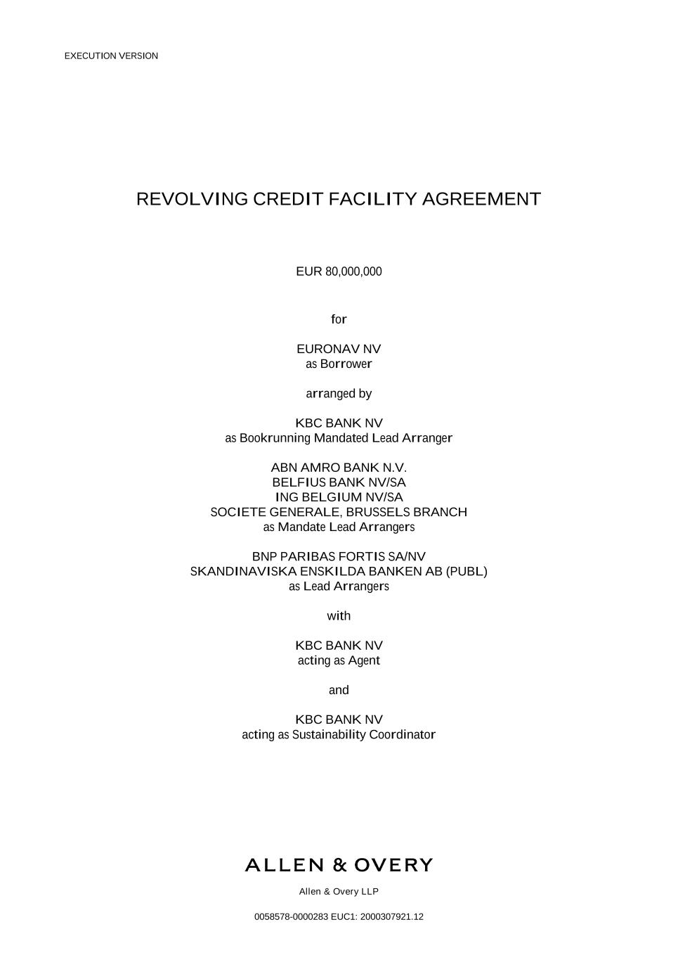EXECUTION VERSION Allen & Overy LLP 0058578-0000283 EUC1: 2000307921.12 REVOLVING CREDIT FACILITY AGREEMENT EUR 80,000,000 for EURONAV NV as Borrower arranged by KBC BANK NV as Bookrunning Mandated Lead Arranger ABN AMRO BANK N.V. BELFIUS BANK NV/SA ING BELGIUM NV/SA SOCIETE GENERALE, BRUSSELS BRANCH as Mandate Lead Arrangers BNP PARIBAS FORTIS SA/NV SKANDINAVISKA ENSKILDA BANKEN AB (PUBL) as Lead Arrangers with KBC BANK NV acting as Agent and KBC BANK NV acting as Sustainability Coordinator