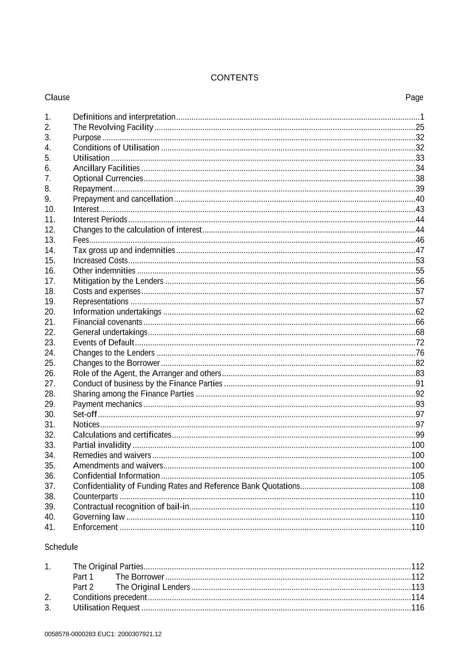 0058578-0000283 EUC1: 2000307921.12 CONTENTS Clause Page 1. Definitions and interpretation ................................................................................................................ 1 2. The Revolving Facility ........................................................................................................................ 25 3. Purpose ................................................................................................................................................ 32 4. Conditions of Utilisation ..................................................................................................................... 32 5. Utilisation ............................................................................................................................................ 33 6. Ancillary Facilities .............................................................................................................................. 34 7. Optional Currencies ............................................................................................................................. 38 8. Repayment ........................................................................................................................................... 39 9. Prepayment and cancellation ............................................................................................................... 40 10. Interest ................................................................................................................................................. 43 11. Interest Periods .................................................................................................................................... 44 12. Changes to the calculation of interest .................................................................................................. 44 13. Fees ...................................................................................................................................................... 46 14. Tax gross up and indemnities .............................................................................................................. 47 15. Increased Costs .................................................................................................................................... 53 16. Other indemnities ................................................................................................................................ 55 17. Mitigation by the Lenders ................................................................................................................... 56 18. Costs and expenses .............................................................................................................................. 57 19. Representations ................................................................................................................................... 57 20. Information undertakings .................................................................................................................... 62 21. Financial covenants ............................................................................................................................. 66 22. General undertakings ........................................................................................................................... 68 23. Events of Default ................................................................................................................................. 72 24. Changes to the Lenders ....................................................................................................................... 76 25. Changes to the Borrower ..................................................................................................................... 82 26. Role of the Agent, the Arranger and others ......................................................................................... 83 27. Conduct of business by the Finance Parties ........................................................................................ 91 28. Sharing among the Finance Parties ..................................................................................................... 92 29. Payment mechanics ............................................................................................................................. 93 30. Set-off .................................................................................................................................................. 97 31. Notices ................................................................................................................................................. 97 32. Calculations and certificates ................................................................................................................ 99 33. Partial invalidity ................................................................................................................................ 100 34. Remedies and waivers ....................................................................................................................... 100 35. Amendments and waivers .................................................................................................................. 100 36. Confidential Information ................................................................................................................... 105 37. Confidentiality of Funding Rates and Reference Bank Quotations ................................................... 108 38. Counterparts ...................................................................................................................................... 110 39. Contractual recognition of bail-in...................................................................................................... 110 40. Governing law ...............................