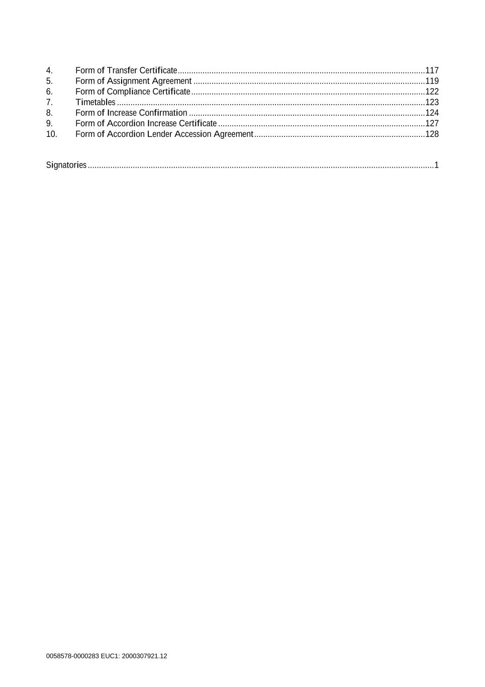 0058578-0000283 EUC1: 2000307921.12 4. Form of Transfer Certificate .............................................................................................................. 117 5. Form of Assignment Agreement ....................................................................................................... 119 6. Form of Compliance Certificate ........................................................................................................ 122 7. Timetables ......................................................................................................................................... 123 8. Form of Increase Confirmation ......................................................................................................... 124 9. Form of Accordion Increase Certificate ............................................................................................ 127 10. Form of Accordion Lender Accession Agreement ............................................................................ 128 Signatories .......................................................................................................................................................... 1