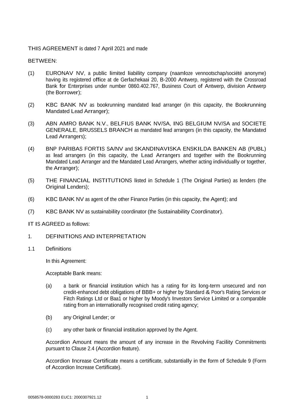 0058578-0000283 EUC1: 2000307921.12 1 THIS AGREEMENT is dated 7 April 2021 and made BETWEEN: (1) EURONAV NV, a public limited liability company (naamloze vennootschap/société anonyme) having its registered office at de Gerlachekaai 20, B-2000 Antwerp, registered with the Crossroad Bank for Enterprises under number 0860.402.767, Business Court of Antwerp, division Antwerp (the Borrower); (2) KBC BANK NV as bookrunning mandated lead arranger (in this capacity, the Bookrunning Mandated Lead Arranger); (3) ABN AMRO BANK N.V., BELFIUS BANK NV/SA, ING BELGIUM NV/SA and SOCIETE GENERALE, BRUSSELS BRANCH as mandated lead arrangers (in this capacity, the Mandated Lead Arrangers); (4) BNP PARIBAS FORTIS SA/NV and SKANDINAVISKA ENSKILDA BANKEN AB (PUBL) as lead arrangers (in this capacity, the Lead Arrangers and together with the Bookrunning Mandated Lead Arranger and the Mandated Lead Arrangers, whether acting individually or together, the Arranger); (5) THE FINANCIAL INSTITUTIONS listed in Schedule 1 (The Original Parties) as lenders (the Original Lenders); (6) KBC BANK NV as agent of the other Finance Parties (in this capacity, the Agent); and (7) KBC BANK NV as sustainability coordinator (the Sustainability Coordinator). IT IS AGREED as follows: 1. DEFINITIONS AND INTERPRETATION 1.1 Definitions In this Agreement: Acceptable Bank means: (a) a bank or financial institution which has a rating for its long-term unsecured and non credit-enhanced debt obligations of BBB+ or higher by Standard & Poor's Rating Services or Fitch Ratings Ltd or Baa1 or higher by Moody's Investors Service Limited or a comparable rating from an internationally recognised credit rating agency; (b) any Original Lender; or (c) any other bank or financial institution approved by the Agent. Accordion Amount means the amount of any increase in the Revolving Facility Commitments pursuant to Clause 2.4 (Accordion feature). Accordion Increase Certificate means a certificate, substantially in the form of Schedule 9 (Form of Accordion Increase Certificate).