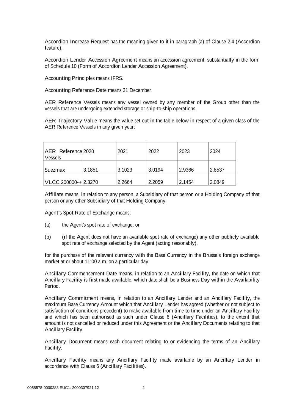 0058578-0000283 EUC1: 2000307921.12 2 Accordion Increase Request has the meaning given to it in paragraph (a) of Clause 2.4 (Accordion feature). Accordion Lender Accession Agreement means an accession agreement, substantially in the form of Schedule 10 (Form of Accordion Lender Accession Agreement). Accounting Principles means IFRS. Accounting Reference Date means 31 December. AER Reference Vessels means any vessel owned by any member of the Group other than the vessels that are undergoing extended storage or ship-to-ship operations. AER Trajectory Value means the value set out in the table below in respect of a given class of the AER Reference Vessels in any given year: AER Reference Vessels 2020 2021 2022 2023 2024 Suezmax 3.1851 3.1023 3.0194 2.9366 2.8537 VLCC 200000-+ 2.3270 2.2664 2.2059 2.1454 2.0849 Affiliate means, in relation to any person, a Subsidiary of that person or a Holding Company of that person or any other Subsidiary of that Holding Company. Agent's Spot Rate of Exchange means: (a) the Agent's spot rate of exchange; or (b) (if the Agent does not have an available spot rate of exchange) any other publicly available spot rate of exchange selected by the Agent (acting reasonably), for the purchase of the relevant currency with the Base Currency in the Brussels foreign exchange market at or about 11:00 a.m. on a particular day. Ancillary Commencement Date means, in relation to an Ancillary Facility, the date on which that Ancillary Facility is first made available, which date shall be a Business Day within the Availability Period. Ancillary Commitment means, in relation to an Ancillary Lender and an Ancillary Facility, the maximum Base Currency Amount which that Ancillary Lender has agreed (whether or not subject to satisfaction of conditions precedent) to make available from time to time under an Ancillary Facility and which has been authorised as such under Clause 6 (Ancillary Facilities), to the extent that amount is not cancelled or reduced under this Agreement or the Ancillary Documents relating to that Ancillary Facility. Ancillary Document means each document relating to or evidencing the terms of an Ancillary Facility. Ancillary Facility means any Ancillary Facility made available by an Ancillary Lender in accordance with Clause 6 (Ancillary Facilities).