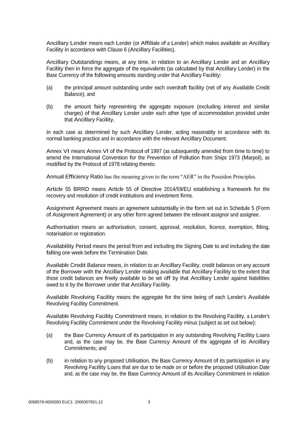 0058578-0000283 EUC1: 2000307921.12 3 Ancillary Lender means each Lender (or Affiliate of a Lender) which makes available an Ancillary Facility in accordance with Clause 6 (Ancillary Facilities). Ancillary Outstandings means, at any time, in relation to an Ancillary Lender and an Ancillary Facility then in force the aggregate of the equivalents (as calculated by that Ancillary Lender) in the Base Currency of the following amounts standing under that Ancillary Facility: (a) the principal amount outstanding under each overdraft facility (net of any Available Credit Balance); and (b) the amount fairly representing the aggregate exposure (excluding interest and similar charges) of that Ancillary Lender under each other type of accommodation provided under that Ancillary Facility, in each case as determined by such Ancillary Lender, acting reasonably in accordance with its normal banking practice and in accordance with the relevant Ancillary Document. Annex VI means Annex VI of the Protocol of 1997 (as subsequently amended from time to time) to amend the International Convention for the Prevention of Pollution from Ships 1973 (Marpol), as modified by the Protocol of 1978 relating thereto. Annual Efficiency Ratio has the meaning given to the term “AER” in the Poseidon Principles. Article 55 BRRD means Article 55 of Directive 2014/59/EU establishing a framework for the recovery and resolution of credit institutions and investment firms. Assignment Agreement means an agreement substantially in the form set out in Schedule 5 (Form of Assignment Agreement) or any other form agreed between the relevant assignor and assignee. Authorisation means an authorisation, consent, approval, resolution, licence, exemption, filing, notarisation or registration. Availability Period means the period from and including the Signing Date to and including the date falling one week before the Termination Date. Available Credit Balance means, in relation to an Ancillary Facility, credit balances on any account of the Borrower with the Ancillary Lender making available that Ancillary Facility to the extent that those credit balances are freely available to be set off by that Ancillary Lender against liabilities owed to it by the Borrower under that Ancillary Facility. Available Revolving Facility means the aggregate for the time being of each Lender's Available Revolving Facility Commitment. Available Revolving Facility Commitment means, in relation to the Revolving Facility, a Lender's Revolving Facility Commitment under the Revolving Facility minus (subject as set out below): (a) the Base Currency Amount of its participation in any outstanding Revolving Facility Loans and, as the case may be, the Base Currency Amount of the aggregate of its Ancillary Commitments; and (b) in relation to any proposed Utilisation, the Base Currency Amount of its participation in any Revolving Facility Loans that are due to be made on or before the proposed Utilisation Date and, as the case may be, the Base Currency Amount of its Ancillary Commitment in relation