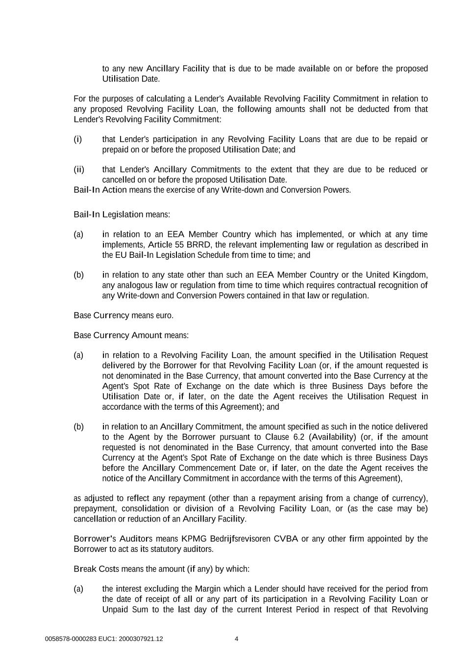 0058578-0000283 EUC1: 2000307921.12 4 to any new Ancillary Facility that is due to be made available on or before the proposed Utilisation Date. For the purposes of calculating a Lender's Available Revolving Facility Commitment in relation to any proposed Revolving Facility Loan, the following amounts shall not be deducted from that Lender's Revolving Facility Commitment: (i) that Lender's participation in any Revolving Facility Loans that are due to be repaid or prepaid on or before the proposed Utilisation Date; and (ii) that Lender's Ancillary Commitments to the extent that they are due to be reduced or cancelled on or before the proposed Utilisation Date. Bail-In Action means the exercise of any Write-down and Conversion Powers. Bail-In Legislation means: (a) in relation to an EEA Member Country which has implemented, or which at any time implements, Article 55 BRRD, the relevant implementing law or regulation as described in the EU Bail-In Legislation Schedule from time to time; and (b) in relation to any state other than such an EEA Member Country or the United Kingdom, any analogous law or regulation from time to time which requires contractual recognition of any Write-down and Conversion Powers contained in that law or regulation. Base Currency means euro. Base Currency Amount means: (a) in relation to a Revolving Facility Loan, the amount specified in the Utilisation Request delivered by the Borrower for that Revolving Facility Loan (or, if the amount requested is not denominated in the Base Currency, that amount converted into the Base Currency at the Agent's Spot Rate of Exchange on the date which is three Business Days before the Utilisation Date or, if later, on the date the Agent receives the Utilisation Request in accordance with the terms of this Agreement); and (b) in relation to an Ancillary Commitment, the amount specified as such in the notice delivered to the Agent by the Borrower pursuant to Clause 6.2 (Availability) (or, if the amount requested is not denominated in the Base Currency, that amount converted into the Base Currency at the Agent's Spot Rate of Exchange on the date which is three Business Days before the Ancillary Commencement Date or, if later, on the date the Agent receives the notice of the Ancillary Commitment in accordance with the terms of this Agreement), as adjusted to reflect any repayment (other than a repayment arising from a change of currency), prepayment, consolidation or division of a Revolving Facility Loan, or (as the case may be) cancellation or reduction of an Ancillary Facility. Borrower's Auditors means KPMG Bedrijfsrevisoren CVBA or any other firm appointed by the Borrower to act as its statutory auditors. Break Costs means the amount (if any) by which: (a) the interest excluding the Margin which a Lender should have received for the period from the date of receipt of all or any part of its participation in a Revolving Facility Loan or Unpaid Sum to the last day of the current Interest Period in respect of that Revolving