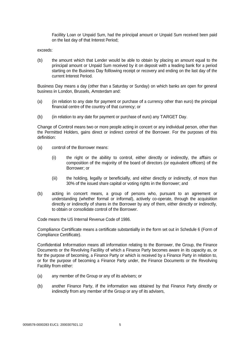 0058578-0000283 EUC1: 2000307921.12 5 Facility Loan or Unpaid Sum, had the principal amount or Unpaid Sum received been paid on the last day of that Interest Period; exceeds: (b) the amount which that Lender would be able to obtain by placing an amount equal to the principal amount or Unpaid Sum received by it on deposit with a leading bank for a period starting on the Business Day following receipt or recovery and ending on the last day of the current Interest Period. Business Day means a day (other than a Saturday or Sunday) on which banks are open for general business in London, Brussels, Amsterdam and: (a) (in relation to any date for payment or purchase of a currency other than euro) the principal financial centre of the country of that currency; or (b) (in relation to any date for payment or purchase of euro) any TARGET Day. Change of Control means two or more people acting in concert or any individual person, other than the Permitted Holders, gains direct or indirect control of the Borrower. For the purposes of this definition: (a) control of the Borrower means: (i) the right or the ability to control, either directly or indirectly, the affairs or composition of the majority of the board of directors (or equivalent officers) of the Borrower; or (ii) the holding, legally or beneficially, and either directly or indirectly, of more than 30% of the issued share capital or voting rights in the Borrower; and (b) acting in concert means, a group of persons who, pursuant to an agreement or understanding (whether formal or informal), actively co-operate, through the acquisition directly or indirectly of shares in the Borrower by any of them, either directly or indirectly, to obtain or consolidate control of the Borrower. Code means the US Internal Revenue Code of 1986. Compliance Certificate means a certificate substantially in the form set out in Schedule 6 (Form of Compliance Certificate). Confidential Information means all information relating to the Borrower, the Group, the Finance Documents or the Revolving Facility of which a Finance Party becomes aware in its capacity as, or for the purpose of becoming, a Finance Party or which is received by a Finance Party in relation to, or for the purpose of becoming a Finance Party under, the Finance Documents or the Revolving Facility from either: (a) any member of the Group or any of its advisers; or (b) another Finance Party, if the information was obtained by that Finance Party directly or indirectly from any member of the Group or any of its advisers,