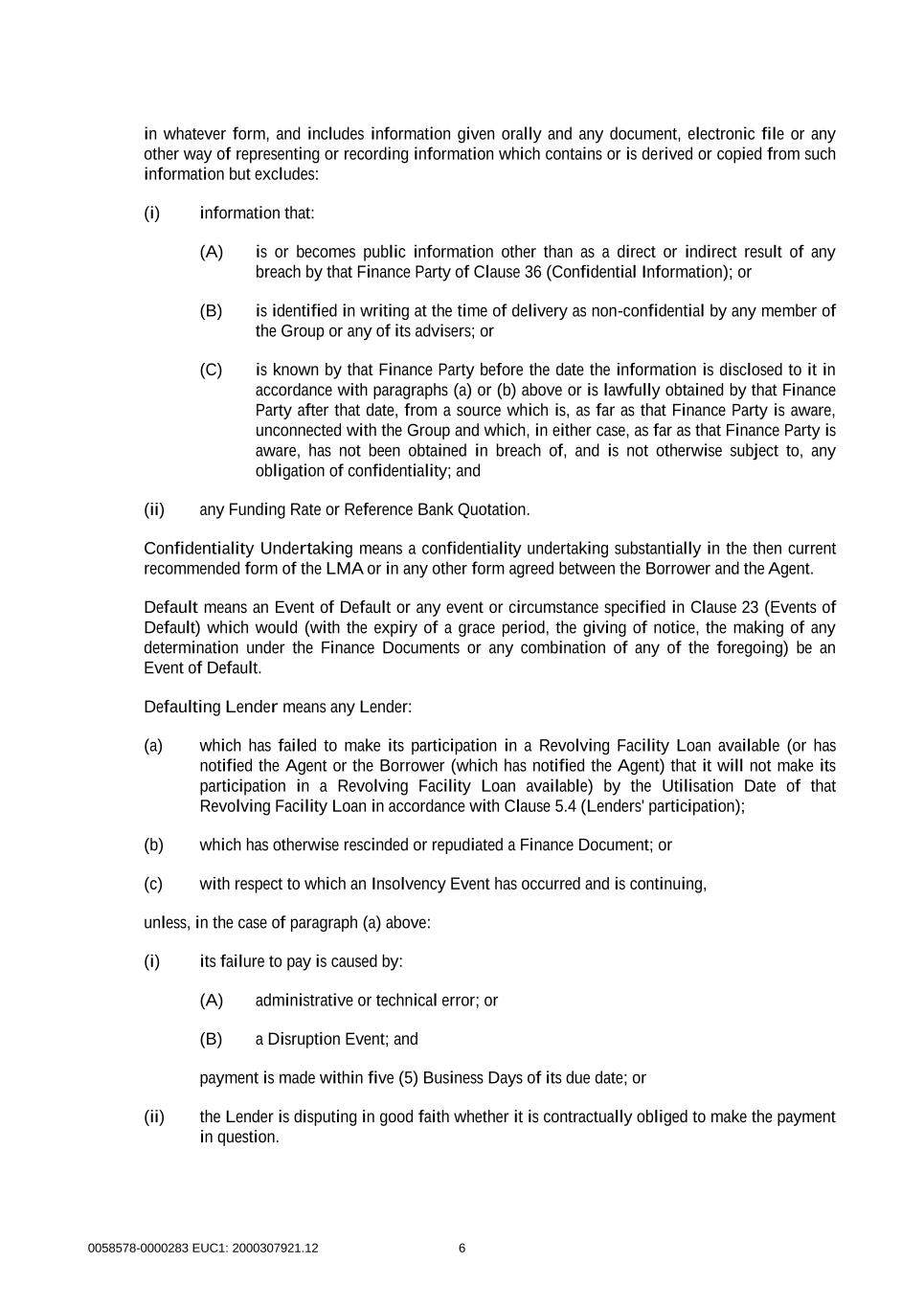 0058578-0000283 EUC1: 2000307921.12 6 in whatever form, and includes information given orally and any document, electronic file or any other way of representing or recording information which contains or is derived or copied from such information but excludes: (i) information that: (A) is or becomes public information other than as a direct or indirect result of any breach by that Finance Party of Clause 36 (Confidential Information); or (B) is identified in writing at the time of delivery as non-confidential by any member of the Group or any of its advisers; or (C) is known by that Finance Party before the date the information is disclosed to it in accordance with paragraphs (a) or (b) above or is lawfully obtained by that Finance Party after that date, from a source which is, as far as that Finance Party is aware, unconnected with the Group and which, in either case, as far as that Finance Party is aware, has not been obtained in breach of, and is not otherwise subject to, any obligation of confidentiality; and (ii) any Funding Rate or Reference Bank Quotation. Confidentiality Undertaking means a confidentiality undertaking substantially in the then current recommended form of the LMA or in any other form agreed between the Borrower and the Agent. Default means an Event of Default or any event or circumstance specified in Clause 23 (Events of Default) which would (with the expiry of a grace period, the giving of notice, the making of any determination under the Finance Documents or any combination of any of the foregoing) be an Event of Default. Defaulting Lender means any Lender: (a) which has failed to make its participation in a Revolving Facility Loan available (or has notified the Agent or the Borrower (which has notified the Agent) that it will not make its participation in a Revolving Facility Loan available) by the Utilisation Date of that Revolving Facility Loan in accordance with Clause 5.4 (Lenders' participation); (b) which has otherwise rescinded or repudiated a Finance Document; or (c) with respect to which an Insolvency Event has occurred and is continuing, unless, in the case of paragraph (a) above: (i) its failure to pay is caused by: (A) administrative or technical error; or (B) a Disruption Event; and payment is made within five (5) Business Days of its due date; or (ii) the Lender is disputing in good faith whether it is contractually obliged to make the payment in question.