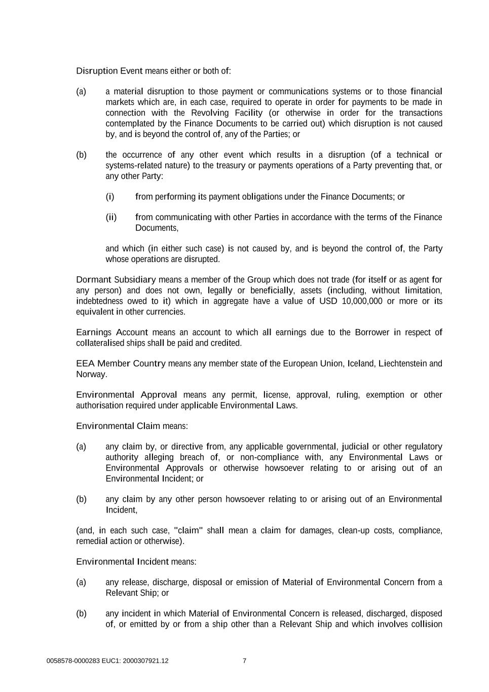0058578-0000283 EUC1: 2000307921.12 7 Disruption Event means either or both of: (a) a material disruption to those payment or communications systems or to those financial markets which are, in each case, required to operate in order for payments to be made in connection with the Revolving Facility (or otherwise in order for the transactions contemplated by the Finance Documents to be carried out) which disruption is not caused by, and is beyond the control of, any of the Parties; or (b) the occurrence of any other event which results in a disruption (of a technical or systems-related nature) to the treasury or payments operations of a Party preventing that, or any other Party: (i) from performing its payment obligations under the Finance Documents; or (ii) from communicating with other Parties in accordance with the terms of the Finance Documents, and which (in either such case) is not caused by, and is beyond the control of, the Party whose operations are disrupted. Dormant Subsidiary means a member of the Group which does not trade (for itself or as agent for any person) and does not own, legally or beneficially, assets (including, without limitation, indebtedness owed to it) which in aggregate have a value of USD 10,000,000 or more or its equivalent in other currencies. Earnings Account means an account to which all earnings due to the Borrower in respect of collateralised ships shall be paid and credited. EEA Member Country means any member state of the European Union, Iceland, Liechtenstein and Norway. Environmental Approval means any permit, license, approval, ruling, exemption or other authorisation required under applicable Environmental Laws. Environmental Claim means: (a) any claim by, or directive from, any applicable governmental, judicial or other regulatory authority alleging breach of, or non-compliance with, any Environmental Laws or Environmental Approvals or otherwise howsoever relating to or arising out of an Environmental Incident; or (b) any claim by any other person howsoever relating to or arising out of an Environmental Incident, (and, in each such case, "claim" shall mean a claim for damages, clean-up costs, compliance, remedial action or otherwise). Environmental Incident means: (a) any release, discharge, disposal or emission of Material of Environmental Concern from a Relevant Ship; or (b) any incident in which Material of Environmental Concern is released, discharged, disposed of, or emitted by or from a ship other than a Relevant Ship and which involves collision