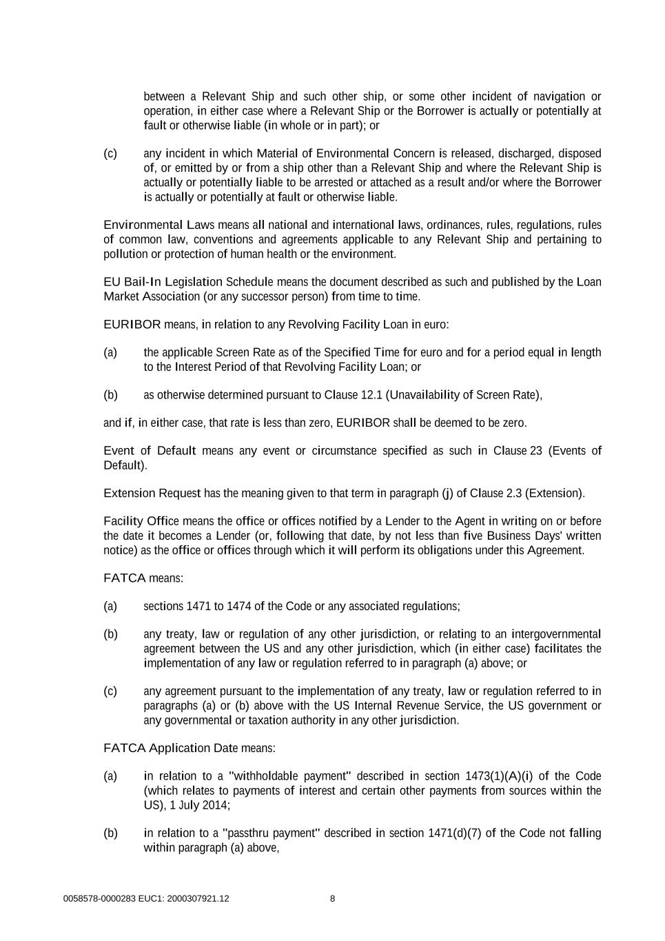 0058578-0000283 EUC1: 2000307921.12 8 between a Relevant Ship and such other ship, or some other incident of navigation or operation, in either case where a Relevant Ship or the Borrower is actually or potentially at fault or otherwise liable (in whole or in part); or (c) any incident in which Material of Environmental Concern is released, discharged, disposed of, or emitted by or from a ship other than a Relevant Ship and where the Relevant Ship is actually or potentially liable to be arrested or attached as a result and/or where the Borrower is actually or potentially at fault or otherwise liable. Environmental Laws means all national and international laws, ordinances, rules, regulations, rules of common law, conventions and agreements applicable to any Relevant Ship and pertaining to pollution or protection of human health or the environment. EU Bail-In Legislation Schedule means the document described as such and published by the Loan Market Association (or any successor person) from time to time. EURIBOR means, in relation to any Revolving Facility Loan in euro: (a) the applicable Screen Rate as of the Specified Time for euro and for a period equal in length to the Interest Period of that Revolving Facility Loan; or (b) as otherwise determined pursuant to Clause 12.1 (Unavailability of Screen Rate), and if, in either case, that rate is less than zero, EURIBOR shall be deemed to be zero. Event of Default means any event or circumstance specified as such in Clause 23 (Events of Default). Extension Request has the meaning given to that term in paragraph (j) of Clause 2.3 (Extension). Facility Office means the office or offices notified by a Lender to the Agent in writing on or before the date it becomes a Lender (or, following that date, by not less than five Business Days' written notice) as the office or offices through which it will perform its obligations under this Agreement. FATCA means: (a) sections 1471 to 1474 of the Code or any associated regulations; (b) any treaty, law or regulation of any other jurisdiction, or relating to an intergovernmental agreement between the US and any other jurisdiction, which (in either case) facilitates the implementation of any law or regulation referred to in paragraph (a) above; or (c) any agreement pursuant to the implementation of any treaty, law or regulation referred to in paragraphs (a) or (b) above with the US Internal Revenue Service, the US government or any governmental or taxation authority in any other jurisdiction. FATCA Application Date means: (a) in relation to a "withholdable payment" described in section 1473(1)(A)(i) of the Code (which relates to payments of interest and certain other payments from sources within the US), 1 July 2014; (b) in relation to a "passthru payment" described in section 1471(d)(7) of the Code not falling within paragraph (a) above,