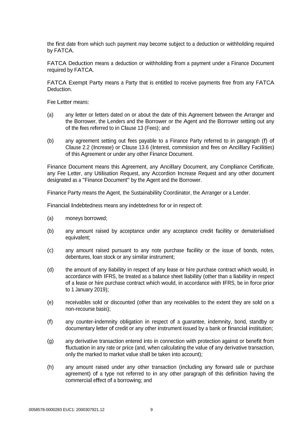 0058578-0000283 EUC1: 2000307921.12 9 the first date from which such payment may become subject to a deduction or withholding required by FATCA. FATCA Deduction means a deduction or withholding from a payment under a Finance Document required by FATCA. FATCA Exempt Party means a Party that is entitled to receive payments free from any FATCA Deduction. Fee Letter means: (a) any letter or letters dated on or about the date of this Agreement between the Arranger and the Borrower, the Lenders and the Borrower or the Agent and the Borrower setting out any of the fees referred to in Clause 13 (Fees); and (b) any agreement setting out fees payable to a Finance Party referred to in paragraph (f) of Clause 2.2 (Increase) or Clause 13.6 (Interest, commission and fees on Ancillary Facilities) of this Agreement or under any other Finance Document. Finance Document means this Agreement, any Ancillary Document, any Compliance Certificate, any Fee Letter, any Utilisation Request, any Accordion Increase Request and any other document designated as a "Finance Document" by the Agent and the Borrower. Finance Party means the Agent, the Sustainability Coordinator, the Arranger or a Lender. Financial Indebtedness means any indebtedness for or in respect of: (a) moneys borrowed; (b) any amount raised by acceptance under any acceptance credit facility or dematerialised equivalent; (c) any amount raised pursuant to any note purchase facility or the issue of bonds, notes, debentures, loan stock or any similar instrument; (d) the amount of any liability in respect of any lease or hire purchase contract which would, in accordance with IFRS, be treated as a balance sheet liability (other than a liability in respect of a lease or hire purchase contract which would, in accordance with IFRS, be in force prior to 1 January 2019); (e) receivables sold or discounted (other than any receivables to the extent they are sold on a non-recourse basis); (f) any counter-indemnity obligation in respect of a guarantee, indemnity, bond, standby or documentary letter of credit or any other instrument issued by a bank or financial institution; (g) any derivative transaction entered into in connection with protection against or benefit from fluctuation in any rate or price (and, when calculating the value of any derivative transaction, only the marked to market value shall be taken into account); (h) any amount raised under any other transaction (including any forward sale or purchase agreement) of a type not referred to in any other paragraph of this definition having the commercial effect of a borrowing; and