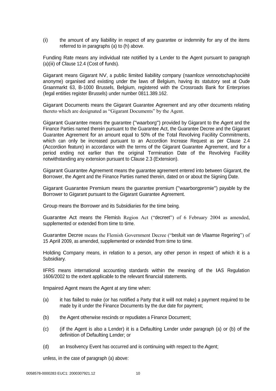 0058578-0000283 EUC1: 2000307921.12 10 (i) the amount of any liability in respect of any guarantee or indemnity for any of the items referred to in paragraphs (a) to (h) above. Funding Rate means any individual rate notified by a Lender to the Agent pursuant to paragraph (a)(ii) of Clause 12.4 (Cost of funds). Gigarant means Gigarant NV, a public limited liability company (naamloze vennootschap/société anonyme) organised and existing under the laws of Belgium, having its statutory seat at Oude Graanmarkt 63, B-1000 Brussels, Belgium, registered with the Crossroads Bank for Enterprises (legal entities register Brussels) under number 0811.389.162. Gigarant Documents means the Gigarant Guarantee Agreement and any other documents relating thereto which are designated as “Gigarant Documents” by the Agent. Gigarant Guarantee means the guarantee ("waarborg") provided by Gigarant to the Agent and the Finance Parties named therein pursuant to the Guarantee Act, the Guarantee Decree and the Gigarant Guarantee Agreement for an amount equal to 50% of the Total Revolving Facility Commitments, which can only be increased pursuant to an Accordion Increase Request as per Clause 2.4 (Accordion feature) in accordance with the terms of the Gigarant Guarantee Agreement, and for a period ending not earlier than the original Termination Date of the Revolving Facility notwithstanding any extension pursuant to Clause 2.3 (Extension). Gigarant Guarantee Agreement means the guarantee agreement entered into between Gigarant, the Borrower, the Agent and the Finance Parties named therein, dated on or about the Signing Date. Gigarant Guarantee Premium means the guarantee premium ("waarborgpremie") payable by the Borrower to Gigarant pursuant to the Gigarant Guarantee Agreement. Group means the Borrower and its Subsidiaries for the time being. Guarantee Act means the Flemish Region Act (“decreet”) of 6 February 2004 as amended, supplemented or extended from time to time. Guarantee Decree means the Flemish Government Decree (“besluit van de Vlaamse Regering”) of 15 April 2009, as amended, supplemented or extended from time to time. Holding Company means, in relation to a person, any other person in respect of which it is a Subsidiary. IFRS means international accounting standards within the meaning of the IAS Regulation 1606/2002 to the extent applicable to the relevant financial statements. Impaired Agent means the Agent at any time when: (a) it has failed to make (or has notified a Party that it will not make) a payment required to be made by it under the Finance Documents by the due date for payment; (b) the Agent otherwise rescinds or repudiates a Finance Document; (c) (if the Agent is also a Lender) it is a Defaulting Lender under paragraph (a) or (b) of the definition of Defaulting Lender; or (d) an Insolvency Event has occurred and is continuing with respect to the Agent; unless, in the case of paragraph (a) above: