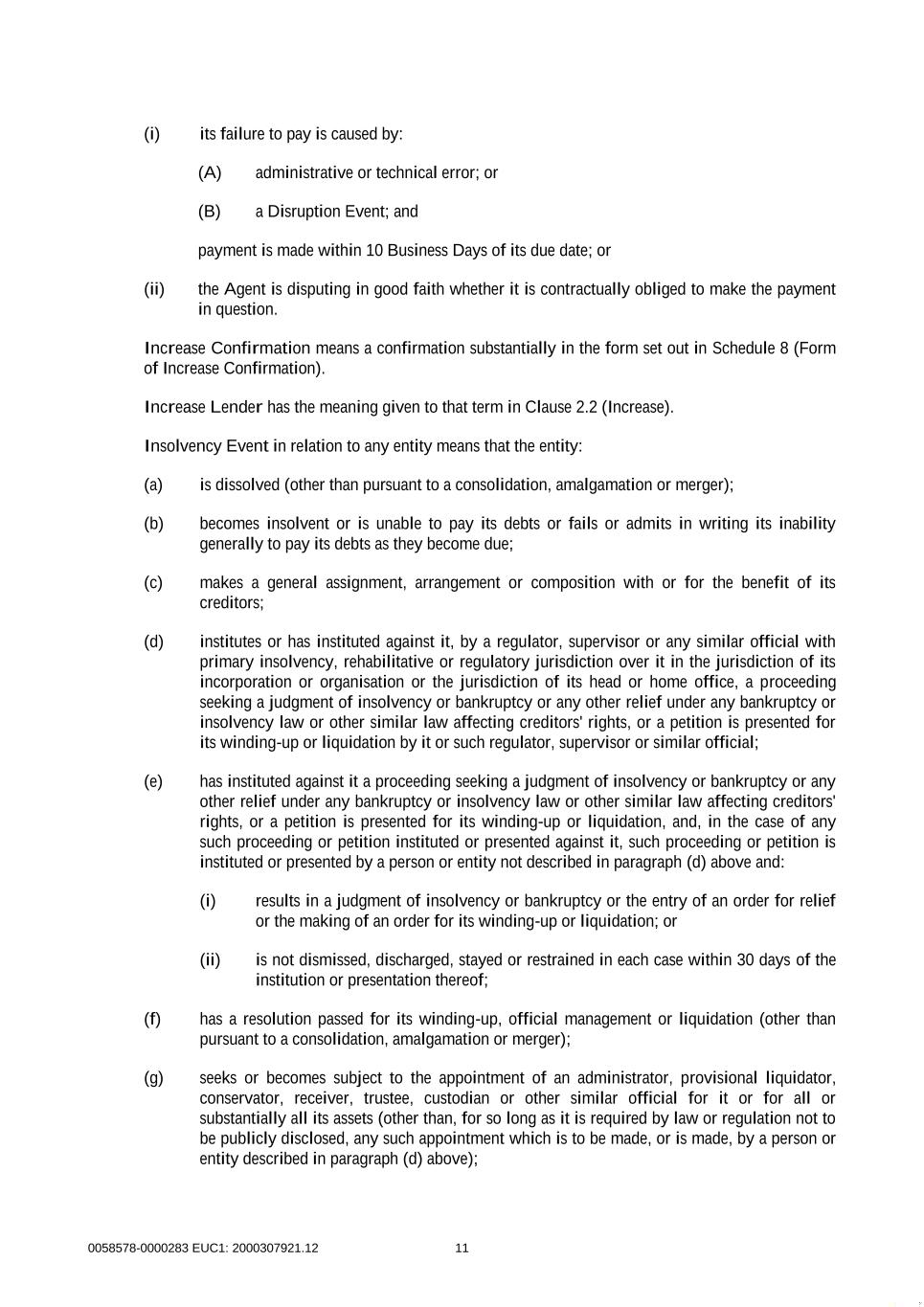 0058578-0000283 EUC1: 2000307921.12 11 (i) its failure to pay is caused by: (A) administrative or technical error; or (B) a Disruption Event; and payment is made within 10 Business Days of its due date; or (ii) the Agent is disputing in good faith whether it is contractually obliged to make the payment in question. Increase Confirmation means a confirmation substantially in the form set out in Schedule 8 (Form of Increase Confirmation). Increase Lender has the meaning given to that term in Clause 2.2 (Increase). Insolvency Event in relation to any entity means that the entity: (a) is dissolved (other than pursuant to a consolidation, amalgamation or merger); (b) becomes insolvent or is unable to pay its debts or fails or admits in writing its inability generally to pay its debts as they become due; (c) makes a general assignment, arrangement or composition with or for the benefit of its creditors; (d) institutes or has instituted against it, by a regulator, supervisor or any similar official with primary insolvency, rehabilitative or regulatory jurisdiction over it in the jurisdiction of its incorporation or organisation or the jurisdiction of its head or home office, a proceeding seeking a judgment of insolvency or bankruptcy or any other relief under any bankruptcy or insolvency law or other similar law affecting creditors' rights, or a petition is presented for its winding-up or liquidation by it or such regulator, supervisor or similar official; (e) has instituted against it a proceeding seeking a judgment of insolvency or bankruptcy or any other relief under any bankruptcy or insolvency law or other similar law affecting creditors' rights, or a petition is presented for its winding-up or liquidation, and, in the case of any such proceeding or petition instituted or presented against it, such proceeding or petition is instituted or presented by a person or entity not described in paragraph (d) above and: (i) results in a judgment of insolvency or bankruptcy or the entry of an order for relief or the making of an order for its winding-up or liquidation; or (ii) is not dismissed, discharged, stayed or restrained in each case within 30 days of the institution or presentation thereof; (f) has a resolution passed for its winding-up, official management or liquidation (other than pursuant to a consolidation, amalgamation or merger); (g) seeks or becomes subject to the appointment of an administrator, provisional liquidator, conservator, receiver, trustee, custodian or other similar official for it or for all or substantially all its assets (other than, for so long as it is required by law or regulation not to be publicly disclosed, any such appointment which is to be made, or is made, by a person or entity described in paragraph (d) above);