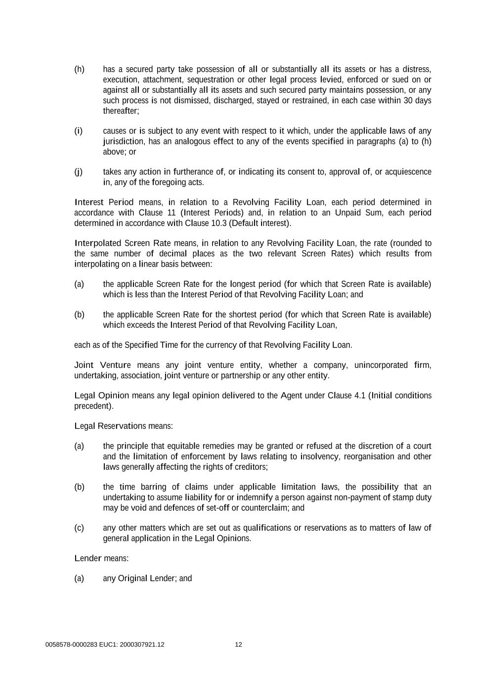 0058578-0000283 EUC1: 2000307921.12 12 (h) has a secured party take possession of all or substantially all its assets or has a distress, execution, attachment, sequestration or other legal process levied, enforced or sued on or against all or substantially all its assets and such secured party maintains possession, or any such process is not dismissed, discharged, stayed or restrained, in each case within 30 days thereafter; (i) causes or is subject to any event with respect to it which, under the applicable laws of any jurisdiction, has an analogous effect to any of the events specified in paragraphs (a) to (h) above; or (j) takes any action in furtherance of, or indicating its consent to, approval of, or acquiescence in, any of the foregoing acts. Interest Period means, in relation to a Revolving Facility Loan, each period determined in accordance with Clause 11 (Interest Periods) and, in relation to an Unpaid Sum, each period determined in accordance with Clause 10.3 (Default interest). Interpolated Screen Rate means, in relation to any Revolving Facility Loan, the rate (rounded to the same number of decimal places as the two relevant Screen Rates) which results from interpolating on a linear basis between: (a) the applicable Screen Rate for the longest period (for which that Screen Rate is available) which is less than the Interest Period of that Revolving Facility Loan; and (b) the applicable Screen Rate for the shortest period (for which that Screen Rate is available) which exceeds the Interest Period of that Revolving Facility Loan, each as of the Specified Time for the currency of that Revolving Facility Loan. Joint Venture means any joint venture entity, whether a company, unincorporated firm, undertaking, association, joint venture or partnership or any other entity. Legal Opinion means any legal opinion delivered to the Agent under Clause 4.1 (Initial conditions precedent). Legal Reservations means: (a) the principle that equitable remedies may be granted or refused at the discretion of a court and the limitation of enforcement by laws relating to insolvency, reorganisation and other laws generally affecting the rights of creditors; (b) the time barring of claims under applicable limitation laws, the possibility that an undertaking to assume liability for or indemnify a person against non-payment of stamp duty may be void and defences of set-off or counterclaim; and (c) any other matters which are set out as qualifications or reservations as to matters of law of general application in the Legal Opinions. Lender means: (a) any Original Lender; and
