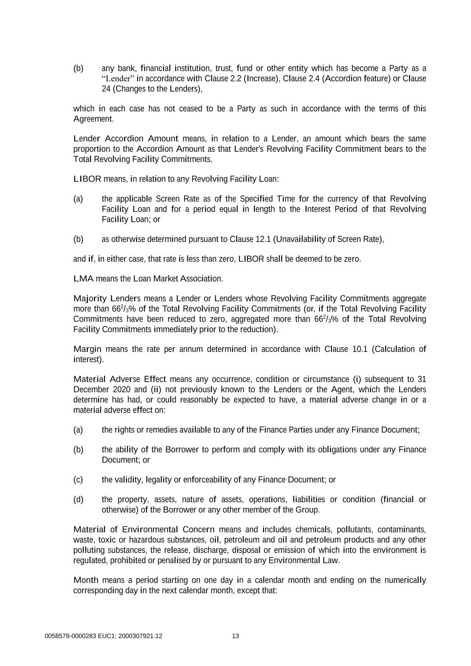 0058578-0000283 EUC1: 2000307921.12 13 (b) any bank, financial institution, trust, fund or other entity which has become a Party as a “Lender” in accordance with Clause 2.2 (Increase), Clause 2.4 (Accordion feature) or Clause 24 (Changes to the Lenders), which in each case has not ceased to be a Party as such in accordance with the terms of this Agreement. Lender Accordion Amount means, in relation to a Lender, an amount which bears the same proportion to the Accordion Amount as that Lender's Revolving Facility Commitment bears to the Total Revolving Facility Commitments. LIBOR means, in relation to any Revolving Facility Loan: (a) the applicable Screen Rate as of the Specified Time for the currency of that Revolving Facility Loan and for a period equal in length to the Interest Period of that Revolving Facility Loan; or (b) as otherwise determined pursuant to Clause 12.1 (Unavailability of Screen Rate), and if, in either case, that rate is less than zero, LIBOR shall be deemed to be zero. LMA means the Loan Market Association. Majority Lenders means a Lender or Lenders whose Revolving Facility Commitments aggregate more than 662/3% of the Total Revolving Facility Commitments (or, if the Total Revolving Facility Commitments have been reduced to zero, aggregated more than 662/3% of the Total Revolving Facility Commitments immediately prior to the reduction). Margin means the rate per annum determined in accordance with Clause 10.1 (Calculation of interest). Material Adverse Effect means any occurrence, condition or circumstance (i) subsequent to 31 December 2020 and (ii) not previously known to the Lenders or the Agent, which the Lenders determine has had, or could reasonably be expected to have, a material adverse change in or a material adverse effect on: (a) the rights or remedies available to any of the Finance Parties under any Finance Document; (b) the ability of the Borrower to perform and comply with its obligations under any Finance Document; or (c) the validity, legality or enforceability of any Finance Document; or (d) the property, assets, nature of assets, operations, liabilities or condition (financial or otherwise) of the Borrower or any other member of the Group. Material of Environmental Concern means and includes chemicals, pollutants, contaminants, waste, toxic or hazardous substances, oil, petroleum and oil and petroleum products and any other polluting substances, the release, discharge, disposal or emission of which into the environment is regulated, prohibited or penalised by or pursuant to any Environmental Law. Month means a period starting on one day in a calendar month and ending on the numerically corresponding day in the next calendar month, except that: