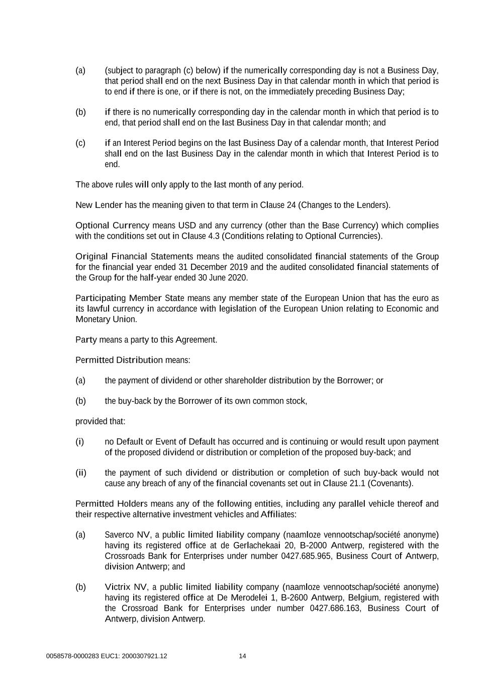 0058578-0000283 EUC1: 2000307921.12 14 (a) (subject to paragraph (c) below) if the numerically corresponding day is not a Business Day, that period shall end on the next Business Day in that calendar month in which that period is to end if there is one, or if there is not, on the immediately preceding Business Day; (b) if there is no numerically corresponding day in the calendar month in which that period is to end, that period shall end on the last Business Day in that calendar month; and (c) if an Interest Period begins on the last Business Day of a calendar month, that Interest Period shall end on the last Business Day in the calendar month in which that Interest Period is to end. The above rules will only apply to the last month of any period. New Lender has the meaning given to that term in Clause 24 (Changes to the Lenders). Optional Currency means USD and any currency (other than the Base Currency) which complies with the conditions set out in Clause 4.3 (Conditions relating to Optional Currencies). Original Financial Statements means the audited consolidated financial statements of the Group for the financial year ended 31 December 2019 and the audited consolidated financial statements of the Group for the half-year ended 30 June 2020. Participating Member State means any member state of the European Union that has the euro as its lawful currency in accordance with legislation of the European Union relating to Economic and Monetary Union. Party means a party to this Agreement. Permitted Distribution means: (a) the payment of dividend or other shareholder distribution by the Borrower; or (b) the buy-back by the Borrower of its own common stock, provided that: (i) no Default or Event of Default has occurred and is continuing or would result upon payment of the proposed dividend or distribution or completion of the proposed buy-back; and (ii) the payment of such dividend or distribution or completion of such buy-back would not cause any breach of any of the financial covenants set out in Clause 21.1 (Covenants). Permitted Holders means any of the following entities, including any parallel vehicle thereof and their respective alternative investment vehicles and Affiliates: (a) Saverco NV, a public limited liability company (naamloze vennootschap/société anonyme) having its registered office at de Gerlachekaai 20, B-2000 Antwerp, registered with the Crossroads Bank for Enterprises under number 0427.685.965, Business Court of Antwerp, division Antwerp; and (b) Victrix NV, a public limited liability company (naamloze vennootschap/société anonyme) having its registered office at De Merodelei 1, B-2600 Antwerp, Belgium, registered with the Crossroad Bank for Enterprises under number 0427.686.163, Business Court of Antwerp, division Antwerp.
