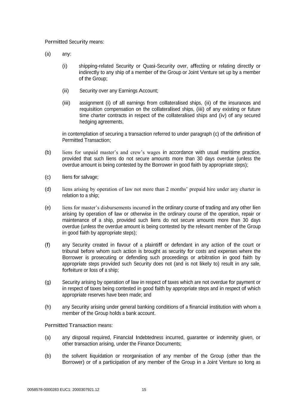 0058578-0000283 EUC1: 2000307921.12 15 Permitted Security means: (a) any: (i) shipping-related Security or Quasi-Security over, affecting or relating directly or indirectly to any ship of a member of the Group or Joint Venture set up by a member of the Group; (ii) Security over any Earnings Account; (iii) assignment (i) of all earnings from collateralised ships, (ii) of the insurances and requisition compensation on the collateralised ships, (iii) of any existing or future time charter contracts in respect of the collateralised ships and (iv) of any secured hedging agreements, in contemplation of securing a transaction referred to under paragraph (c) of the definition of Permitted Transaction; (b) liens for unpaid master’s and crew’s wages in accordance with usual maritime practice, provided that such liens do not secure amounts more than 30 days overdue (unless the overdue amount is being contested by the Borrower in good faith by appropriate steps); (c) liens for salvage; (d) liens arising by operation of law not more than 2 months’ prepaid hire under any charter in relation to a ship; (e) liens for master’s disbursements incurred in the ordinary course of trading and any other lien arising by operation of law or otherwise in the ordinary course of the operation, repair or maintenance of a ship, provided such liens do not secure amounts more than 30 days overdue (unless the overdue amount is being contested by the relevant member of the Group in good faith by appropriate steps); (f) any Security created in favour of a plaintiff or defendant in any action of the court or tribunal before whom such action is brought as security for costs and expenses where the Borrower is prosecuting or defending such proceedings or arbitration in good faith by appropriate steps provided such Security does not (and is not likely to) result in any sale, forfeiture or loss of a ship; (g) Security arising by operation of law in respect of taxes which are not overdue for payment or in respect of taxes being contested in good faith by appropriate steps and in respect of which appropriate reserves have been made; and (h) any Security arising under general banking conditions of a financial institution with whom a member of the Group holds a bank account. Permitted Transaction means: (a) any disposal required, Financial Indebtedness incurred, guarantee or indemnity given, or other transaction arising, under the Finance Documents; (b) the solvent liquidation or reorganisation of any member of the Group (other than the Borrower) or of a participation of any member of the Group in a Joint Venture so long as