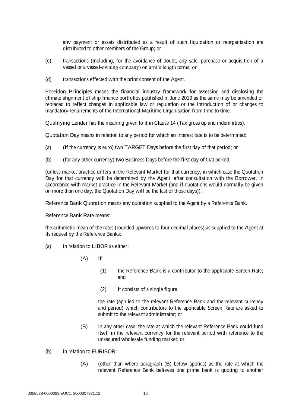 0058578-0000283 EUC1: 2000307921.12 16 any payment or assets distributed as a result of such liquidation or reorganisation are distributed to other members of the Group; or (c) transactions (including, for the avoidance of doubt, any sale, purchase or acquisition of a vessel or a vessel-owning company) on arm’s length terms; or (d) transactions effected with the prior consent of the Agent. Poseidon Principles means the financial industry framework for assessing and disclosing the climate alignment of ship finance portfolios published in June 2019 as the same may be amended or replaced to reflect changes in applicable law or regulation or the introduction of or changes to mandatory requirements of the International Maritime Organisation from time to time. Qualifying Lender has the meaning given to it in Clause 14 (Tax gross up and indemnities). Quotation Day means in relation to any period for which an interest rate is to be determined: (a) (if the currency is euro) two TARGET Days before the first day of that period; or (b) (for any other currency) two Business Days before the first day of that period, (unless market practice differs in the Relevant Market for that currency, in which case the Quotation Day for that currency will be determined by the Agent, after consultation with the Borrower, in accordance with market practice in the Relevant Market (and if quotations would normally be given on more than one day, the Quotation Day will be the last of those days)). Reference Bank Quotation means any quotation supplied to the Agent by a Reference Bank. Reference Bank Rate means: the arithmetic mean of the rates (rounded upwards to four decimal places) as supplied to the Agent at its request by the Reference Banks: (a) in relation to LIBOR as either: (A) if: (1) the Reference Bank is a contributor to the applicable Screen Rate; and (2) it consists of a single figure, the rate (applied to the relevant Reference Bank and the relevant currency and period) which contributors to the applicable Screen Rate are asked to submit to the relevant administrator; or (B) in any other case, the rate at which the relevant Reference Bank could fund itself in the relevant currency for the relevant period with reference to the unsecured wholesale funding market; or (b) in relation to EURIBOR: (A) (other than where paragraph (B) below applies) as the rate at which the relevant Reference Bank believes one prime bank is quoting to another