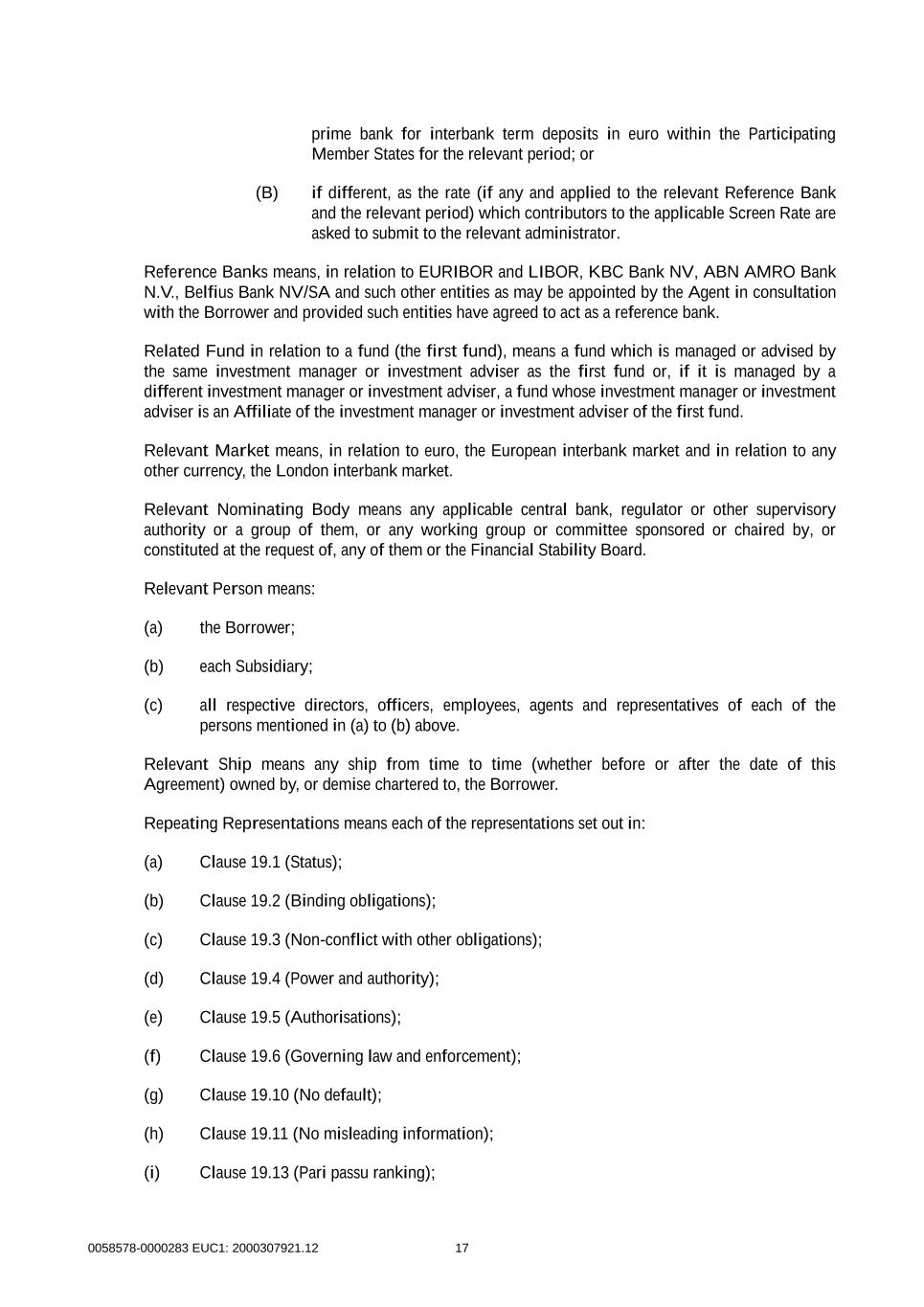 0058578-0000283 EUC1: 2000307921.12 17 prime bank for interbank term deposits in euro within the Participating Member States for the relevant period; or (B) if different, as the rate (if any and applied to the relevant Reference Bank and the relevant period) which contributors to the applicable Screen Rate are asked to submit to the relevant administrator. Reference Banks means, in relation to EURIBOR and LIBOR, KBC Bank NV, ABN AMRO Bank N.V., Belfius Bank NV/SA and such other entities as may be appointed by the Agent in consultation with the Borrower and provided such entities have agreed to act as a reference bank. Related Fund in relation to a fund (the first fund), means a fund which is managed or advised by the same investment manager or investment adviser as the first fund or, if it is managed by a different investment manager or investment adviser, a fund whose investment manager or investment adviser is an Affiliate of the investment manager or investment adviser of the first fund. Relevant Market means, in relation to euro, the European interbank market and in relation to any other currency, the London interbank market. Relevant Nominating Body means any applicable central bank, regulator or other supervisory authority or a group of them, or any working group or committee sponsored or chaired by, or constituted at the request of, any of them or the Financial Stability Board. Relevant Person means: (a) the Borrower; (b) each Subsidiary; (c) all respective directors, officers, employees, agents and representatives of each of the persons mentioned in (a) to (b) above. Relevant Ship means any ship from time to time (whether before or after the date of this Agreement) owned by, or demise chartered to, the Borrower. Repeating Representations means each of the representations set out in: (a) Clause 19.1 (Status); (b) Clause 19.2 (Binding obligations); (c) Clause 19.3 (Non-conflict with other obligations); (d) Clause 19.4 (Power and authority); (e) Clause 19.5 (Authorisations); (f) Clause 19.6 (Governing law and enforcement); (g) Clause 19.10 (No default); (h) Clause 19.11 (No misleading information); (i) Clause 19.13 (Pari passu ranking);