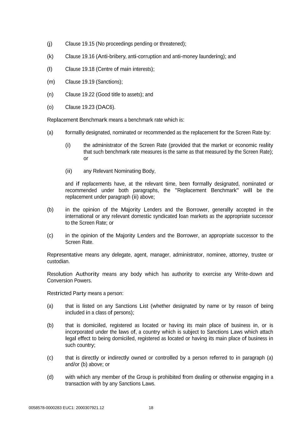 0058578-0000283 EUC1: 2000307921.12 18 (j) Clause 19.15 (No proceedings pending or threatened); (k) Clause 19.16 (Anti-bribery, anti-corruption and anti-money laundering); and (l) Clause 19.18 (Centre of main interests); (m) Clause 19.19 (Sanctions); (n) Clause 19.22 (Good title to assets); and (o) Clause 19.23 (DAC6). Replacement Benchmark means a benchmark rate which is: (a) formally designated, nominated or recommended as the replacement for the Screen Rate by: (i) the administrator of the Screen Rate (provided that the market or economic reality that such benchmark rate measures is the same as that measured by the Screen Rate); or (ii) any Relevant Nominating Body, and if replacements have, at the relevant time, been formally designated, nominated or recommended under both paragraphs, the "Replacement Benchmark" will be the replacement under paragraph (ii) above; (b) in the opinion of the Majority Lenders and the Borrower, generally accepted in the international or any relevant domestic syndicated loan markets as the appropriate successor to the Screen Rate; or (c) in the opinion of the Majority Lenders and the Borrower, an appropriate successor to the Screen Rate. Representative means any delegate, agent, manager, administrator, nominee, attorney, trustee or custodian. Resolution Authority means any body which has authority to exercise any Write-down and Conversion Powers. Restricted Party means a person: (a) that is listed on any Sanctions List (whether designated by name or by reason of being included in a class of persons); (b) that is domiciled, registered as located or having its main place of business in, or is incorporated under the laws of, a country which is subject to Sanctions Laws which attach legal effect to being domiciled, registered as located or having its main place of business in such country; (c) that is directly or indirectly owned or controlled by a person referred to in paragraph (a) and/or (b) above; or (d) with which any member of the Group is prohibited from dealing or otherwise engaging in a transaction with by any Sanctions Laws.