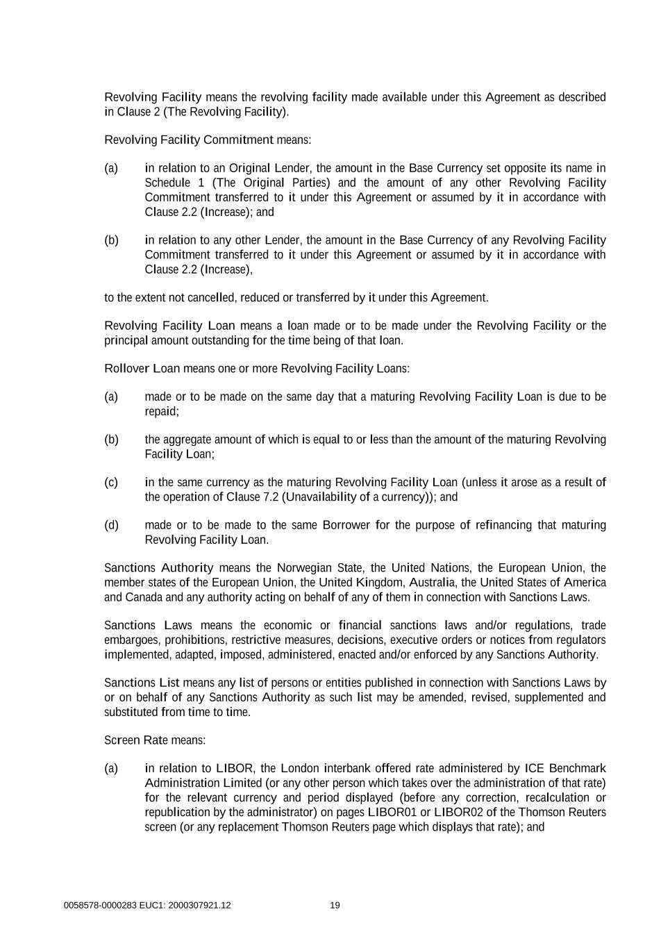 0058578-0000283 EUC1: 2000307921.12 19 Revolving Facility means the revolving facility made available under this Agreement as described in Clause 2 (The Revolving Facility). Revolving Facility Commitment means: (a) in relation to an Original Lender, the amount in the Base Currency set opposite its name in Schedule 1 (The Original Parties) and the amount of any other Revolving Facility Commitment transferred to it under this Agreement or assumed by it in accordance with Clause 2.2 (Increase); and (b) in relation to any other Lender, the amount in the Base Currency of any Revolving Facility Commitment transferred to it under this Agreement or assumed by it in accordance with Clause 2.2 (Increase), to the extent not cancelled, reduced or transferred by it under this Agreement. Revolving Facility Loan means a loan made or to be made under the Revolving Facility or the principal amount outstanding for the time being of that loan. Rollover Loan means one or more Revolving Facility Loans: (a) made or to be made on the same day that a maturing Revolving Facility Loan is due to be repaid; (b) the aggregate amount of which is equal to or less than the amount of the maturing Revolving Facility Loan; (c) in the same currency as the maturing Revolving Facility Loan (unless it arose as a result of the operation of Clause 7.2 (Unavailability of a currency)); and (d) made or to be made to the same Borrower for the purpose of refinancing that maturing Revolving Facility Loan. Sanctions Authority means the Norwegian State, the United Nations, the European Union, the member states of the European Union, the United Kingdom, Australia, the United States of America and Canada and any authority acting on behalf of any of them in connection with Sanctions Laws. Sanctions Laws means the economic or financial sanctions laws and/or regulations, trade embargoes, prohibitions, restrictive measures, decisions, executive orders or notices from regulators implemented, adapted, imposed, administered, enacted and/or enforced by any Sanctions Authority. Sanctions List means any list of persons or entities published in connection with Sanctions Laws by or on behalf of any Sanctions Authority as such list may be amended, revised, supplemented and substituted from time to time. Screen Rate means: (a) in relation to LIBOR, the London interbank offered rate administered by ICE Benchmark Administration Limited (or any other person which takes over the administration of that rate) for the relevant currency and period displayed (before any correction, recalculation or republication by the administrator) on pages LIBOR01 or LIBOR02 of the Thomson Reuters screen (or any replacement Thomson Reuters page which displays that rate); and