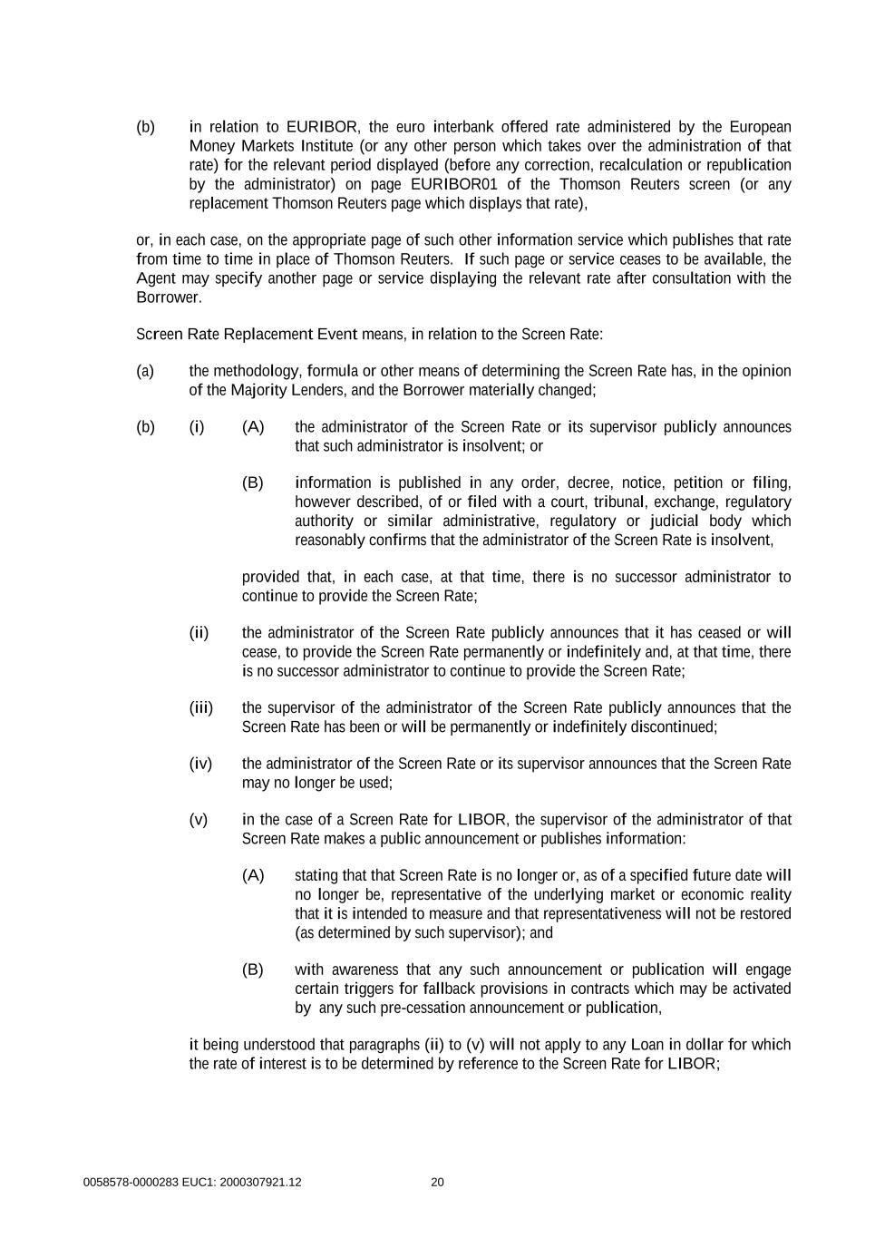 0058578-0000283 EUC1: 2000307921.12 20 (b) in relation to EURIBOR, the euro interbank offered rate administered by the European Money Markets Institute (or any other person which takes over the administration of that rate) for the relevant period displayed (before any correction, recalculation or republication by the administrator) on page EURIBOR01 of the Thomson Reuters screen (or any replacement Thomson Reuters page which displays that rate), or, in each case, on the appropriate page of such other information service which publishes that rate from time to time in place of Thomson Reuters. If such page or service ceases to be available, the Agent may specify another page or service displaying the relevant rate after consultation with the Borrower. Screen Rate Replacement Event means, in relation to the Screen Rate: (a) the methodology, formula or other means of determining the Screen Rate has, in the opinion of the Majority Lenders, and the Borrower materially changed; (b) (i) (A) the administrator of the Screen Rate or its supervisor publicly announces that such administrator is insolvent; or (B) information is published in any order, decree, notice, petition or filing, however described, of or filed with a court, tribunal, exchange, regulatory authority or similar administrative, regulatory or judicial body which reasonably confirms that the administrator of the Screen Rate is insolvent, provided that, in each case, at that time, there is no successor administrator to continue to provide the Screen Rate; (ii) the administrator of the Screen Rate publicly announces that it has ceased or will cease, to provide the Screen Rate permanently or indefinitely and, at that time, there is no successor administrator to continue to provide the Screen Rate; (iii) the supervisor of the administrator of the Screen Rate publicly announces that the Screen Rate has been or will be permanently or indefinitely discontinued; (iv) the administrator of the Screen Rate or its supervisor announces that the Screen Rate may no longer be used; (v) in the case of a Screen Rate for LIBOR, the supervisor of the administrator of that Screen Rate makes a public announcement or publishes information: (A) stating that that Screen Rate is no longer or, as of a specified future date will no longer be, representative of the underlying market or economic reality that it is intended to measure and that representativeness will not be restored (as determined by such supervisor); and (B) with awareness that any such announcement or publication will engage certain triggers for fallback provisions in contracts which may be activated by any such pre-cessation announcement or publication, it being understood that paragraphs (ii) to (v) will not apply to any Loan in dollar for which the rate of interest is to be determined by reference to the Screen Rate for LIBOR;