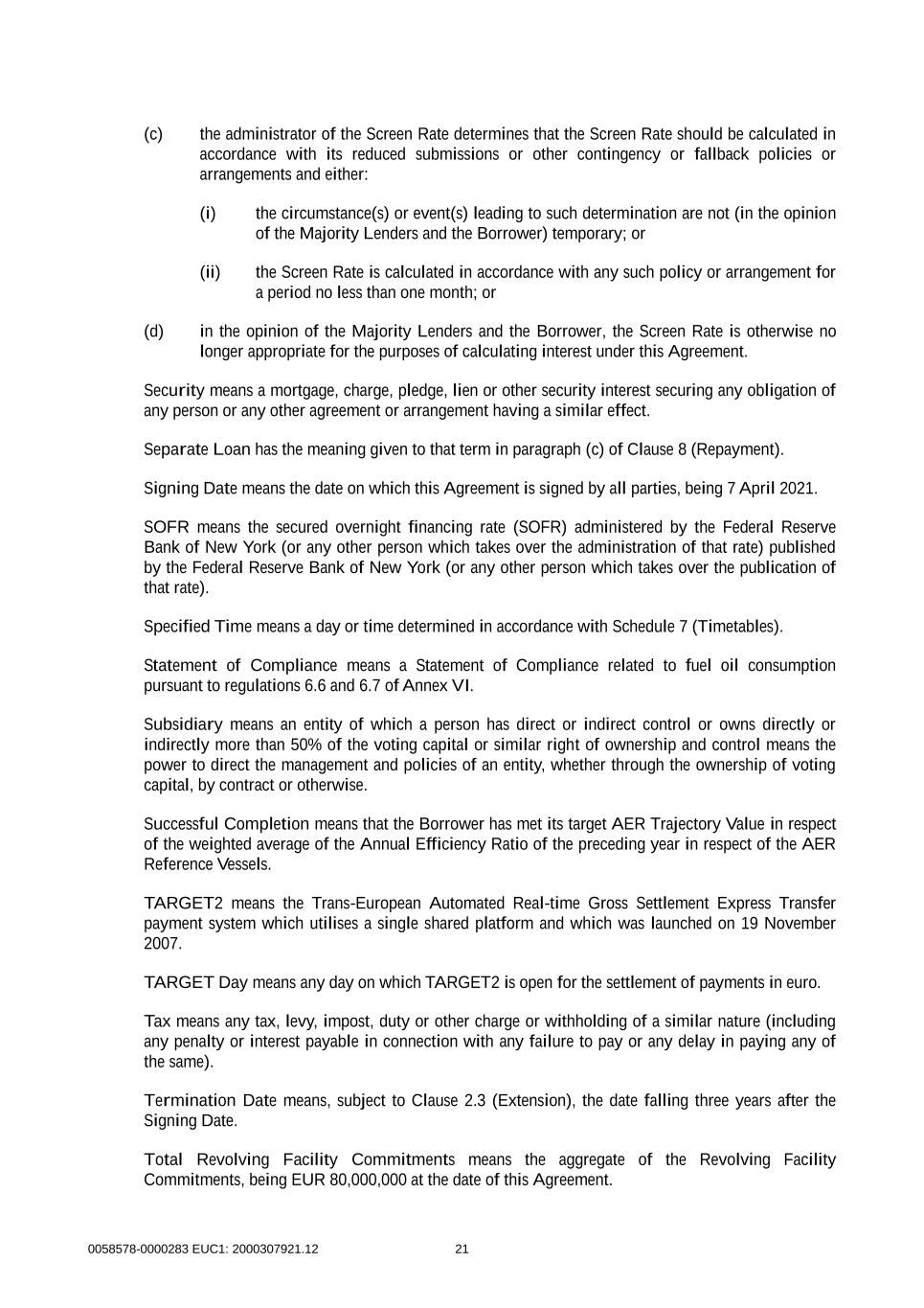 0058578-0000283 EUC1: 2000307921.12 21 (c) the administrator of the Screen Rate determines that the Screen Rate should be calculated in accordance with its reduced submissions or other contingency or fallback policies or arrangements and either: (i) the circumstance(s) or event(s) leading to such determination are not (in the opinion of the Majority Lenders and the Borrower) temporary; or (ii) the Screen Rate is calculated in accordance with any such policy or arrangement for a period no less than one month; or (d) in the opinion of the Majority Lenders and the Borrower, the Screen Rate is otherwise no longer appropriate for the purposes of calculating interest under this Agreement. Security means a mortgage, charge, pledge, lien or other security interest securing any obligation of any person or any other agreement or arrangement having a similar effect. Separate Loan has the meaning given to that term in paragraph (c) of Clause 8 (Repayment). Signing Date means the date on which this Agreement is signed by all parties, being 7 April 2021. SOFR means the secured overnight financing rate (SOFR) administered by the Federal Reserve Bank of New York (or any other person which takes over the administration of that rate) published by the Federal Reserve Bank of New York (or any other person which takes over the publication of that rate). Specified Time means a day or time determined in accordance with Schedule 7 (Timetables). Statement of Compliance means a Statement of Compliance related to fuel oil consumption pursuant to regulations 6.6 and 6.7 of Annex VI. Subsidiary means an entity of which a person has direct or indirect control or owns directly or indirectly more than 50% of the voting capital or similar right of ownership and control means the power to direct the management and policies of an entity, whether through the ownership of voting capital, by contract or otherwise. Successful Completion means that the Borrower has met its target AER Trajectory Value in respect of the weighted average of the Annual Efficiency Ratio of the preceding year in respect of the AER Reference Vessels. TARGET2 means the Trans-European Automated Real-time Gross Settlement Express Transfer payment system which utilises a single shared platform and which was launched on 19 November 2007. TARGET Day means any day on which TARGET2 is open for the settlement of payments in euro. Tax means any tax, levy, impost, duty or other charge or withholding of a similar nature (including any penalty or interest payable in connection with any failure to pay or any delay in paying any of the same). Termination Date means, subject to Clause 2.3 (Extension), the date falling three years after the Signing Date. Total Revolving Facility Commitments means the aggregate of the Revolving Facility Commitments, being EUR 80,000,000 at the date of this Agreement.