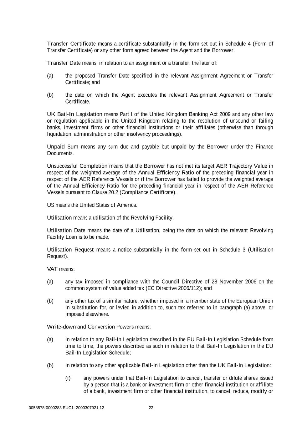 0058578-0000283 EUC1: 2000307921.12 22 Transfer Certificate means a certificate substantially in the form set out in Schedule 4 (Form of Transfer Certificate) or any other form agreed between the Agent and the Borrower. Transfer Date means, in relation to an assignment or a transfer, the later of: (a) the proposed Transfer Date specified in the relevant Assignment Agreement or Transfer Certificate; and (b) the date on which the Agent executes the relevant Assignment Agreement or Transfer Certificate. UK Bail-In Legislation means Part I of the United Kingdom Banking Act 2009 and any other law or regulation applicable in the United Kingdom relating to the resolution of unsound or failing banks, investment firms or other financial institutions or their affiliates (otherwise than through liquidation, administration or other insolvency proceedings). Unpaid Sum means any sum due and payable but unpaid by the Borrower under the Finance Documents. Unsuccessful Completion means that the Borrower has not met its target AER Trajectory Value in respect of the weighted average of the Annual Efficiency Ratio of the preceding financial year in respect of the AER Reference Vessels or if the Borrower has failed to provide the weighted average of the Annual Efficiency Ratio for the preceding financial year in respect of the AER Reference Vessels pursuant to Clause 20.2 (Compliance Certificate). US means the United States of America. Utilisation means a utilisation of the Revolving Facility. Utilisation Date means the date of a Utilisation, being the date on which the relevant Revolving Facility Loan is to be made. Utilisation Request means a notice substantially in the form set out in Schedule 3 (Utilisation Request). VAT means: (a) any tax imposed in compliance with the Council Directive of 28 November 2006 on the common system of value added tax (EC Directive 2006/112); and (b) any other tax of a similar nature, whether imposed in a member state of the European Union in substitution for, or levied in addition to, such tax referred to in paragraph (a) above, or imposed elsewhere. Write-down and Conversion Powers means: (a) in relation to any Bail-In Legislation described in the EU Bail-In Legislation Schedule from time to time, the powers described as such in relation to that Bail-In Legislation in the EU Bail-In Legislation Schedule; (b) in relation to any other applicable Bail-In Legislation other than the UK Bail-In Legislation: (i) any powers under that Bail-In Legislation to cancel, transfer or dilute shares issued by a person that is a bank or investment firm or other financial institution or affiliate of a bank, investment firm or other financial institution, to cancel, reduce, modify or