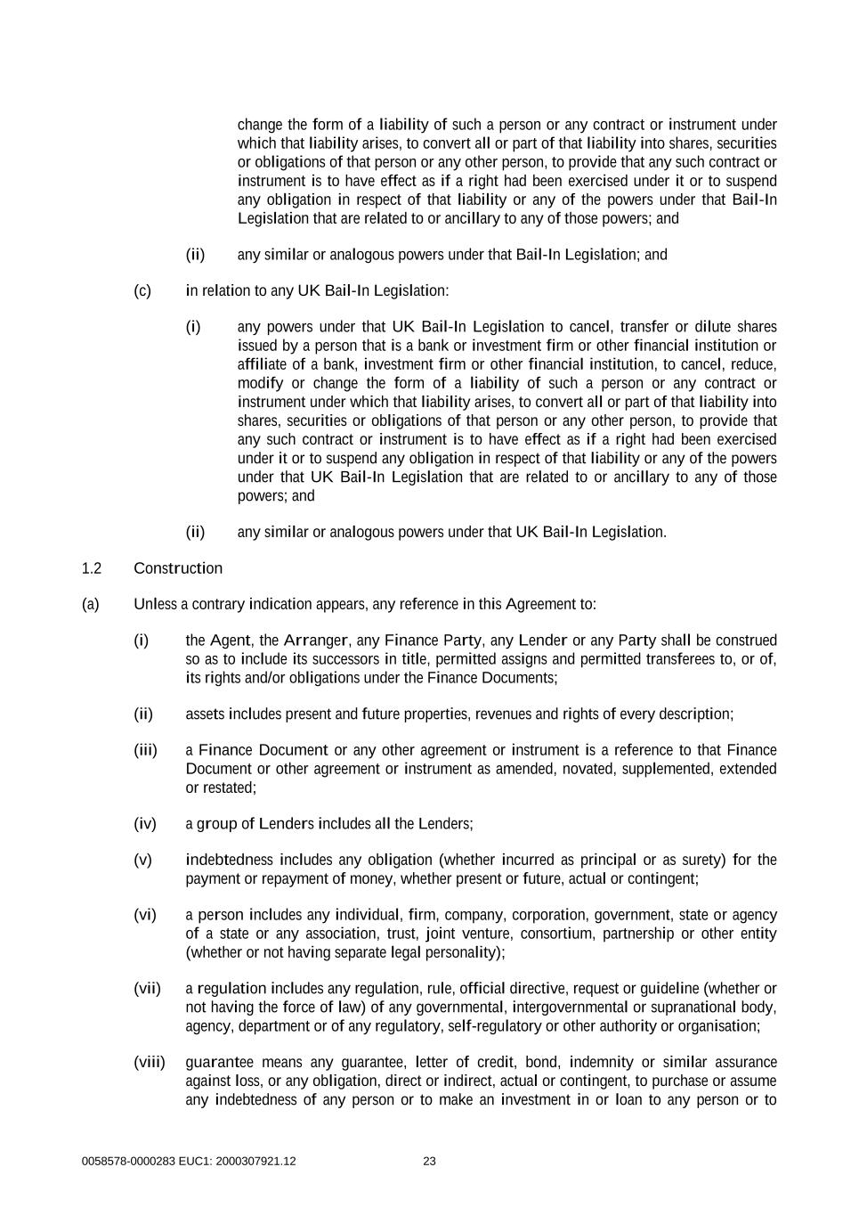 0058578-0000283 EUC1: 2000307921.12 23 change the form of a liability of such a person or any contract or instrument under which that liability arises, to convert all or part of that liability into shares, securities or obligations of that person or any other person, to provide that any such contract or instrument is to have effect as if a right had been exercised under it or to suspend any obligation in respect of that liability or any of the powers under that Bail-In Legislation that are related to or ancillary to any of those powers; and (ii) any similar or analogous powers under that Bail-In Legislation; and (c) in relation to any UK Bail-In Legislation: (i) any powers under that UK Bail-In Legislation to cancel, transfer or dilute shares issued by a person that is a bank or investment firm or other financial institution or affiliate of a bank, investment firm or other financial institution, to cancel, reduce, modify or change the form of a liability of such a person or any contract or instrument under which that liability arises, to convert all or part of that liability into shares, securities or obligations of that person or any other person, to provide that any such contract or instrument is to have effect as if a right had been exercised under it or to suspend any obligation in respect of that liability or any of the powers under that UK Bail-In Legislation that are related to or ancillary to any of those powers; and (ii) any similar or analogous powers under that UK Bail-In Legislation. 1.2 Construction (a) Unless a contrary indication appears, any reference in this Agreement to: (i) the Agent, the Arranger, any Finance Party, any Lender or any Party shall be construed so as to include its successors in title, permitted assigns and permitted transferees to, or of, its rights and/or obligations under the Finance Documents; (ii) assets includes present and future properties, revenues and rights of every description; (iii) a Finance Document or any other agreement or instrument is a reference to that Finance Document or other agreement or instrument as amended, novated, supplemented, extended or restated; (iv) a group of Lenders includes all the Lenders; (v) indebtedness includes any obligation (whether incurred as principal or as surety) for the payment or repayment of money, whether present or future, actual or contingent; (vi) a person includes any individual, firm, company, corporation, government, state or agency of a state or any association, trust, joint venture, consortium, partnership or other entity (whether or not having separate legal personality); (vii) a regulation includes any regulation, rule, official directive, request or guideline (whether or not having the force of law) of any governmental, intergovernmental or supranational body, agency, department or of any regulatory, self-regulatory or other authority or organisation; (viii) guarantee means any guarantee, letter of credit, bond, indemnity or similar assurance against loss, or any obligation, direct or indirect, actual or contingent, to purchase or assume any indebtedness of any person or to make an investment in or loan to any person or to