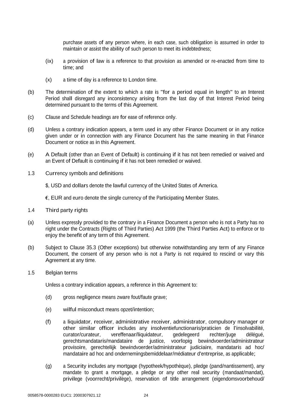 0058578-0000283 EUC1: 2000307921.12 24 purchase assets of any person where, in each case, such obligation is assumed in order to maintain or assist the ability of such person to meet its indebtedness; (ix) a provision of law is a reference to that provision as amended or re-enacted from time to time; and (x) a time of day is a reference to London time. (b) The determination of the extent to which a rate is "for a period equal in length" to an Interest Period shall disregard any inconsistency arising from the last day of that Interest Period being determined pursuant to the terms of this Agreement. (c) Clause and Schedule headings are for ease of reference only. (d) Unless a contrary indication appears, a term used in any other Finance Document or in any notice given under or in connection with any Finance Document has the same meaning in that Finance Document or notice as in this Agreement. (e) A Default (other than an Event of Default) is continuing if it has not been remedied or waived and an Event of Default is continuing if it has not been remedied or waived. 1.3 Currency symbols and definitions $, USD and dollars denote the lawful currency of the United States of America. €, EUR and euro denote the single currency of the Participating Member States. 1.4 Third party rights (a) Unless expressly provided to the contrary in a Finance Document a person who is not a Party has no right under the Contracts (Rights of Third Parties) Act 1999 (the Third Parties Act) to enforce or to enjoy the benefit of any term of this Agreement. (b) Subject to Clause 35.3 (Other exceptions) but otherwise notwithstanding any term of any Finance Document, the consent of any person who is not a Party is not required to rescind or vary this Agreement at any time. 1.5 Belgian terms Unless a contrary indication appears, a reference in this Agreement to: (d) gross negligence means zware fout/faute grave; (e) wilful misconduct means opzet/intention; (f) a liquidator, receiver, administrative receiver, administrator, compulsory manager or other similar officer includes any insolventiefunctionaris/praticien de l'insolvabilité, curator/curateur, vereffenaar/liquidateur, gedelegeerd rechter/juge délégué, gerechtsmandataris/mandataire de justice, voorlopig bewindvoerder/administrateur provisoire, gerechtelijk bewindvoerder/administrateur judiciaire, mandataris ad hoc/ mandataire ad hoc and ondernemingsbemiddelaar/médiateur d'entreprise, as applicable; (g) a Security includes any mortgage (hypotheek/hypothèque), pledge (pand/nantissement), any mandate to grant a mortgage, a pledge or any other real security (mandaat/mandat), privilege (voorrecht/privilège), reservation of title arrangement (eigendomsvoorbehoud/