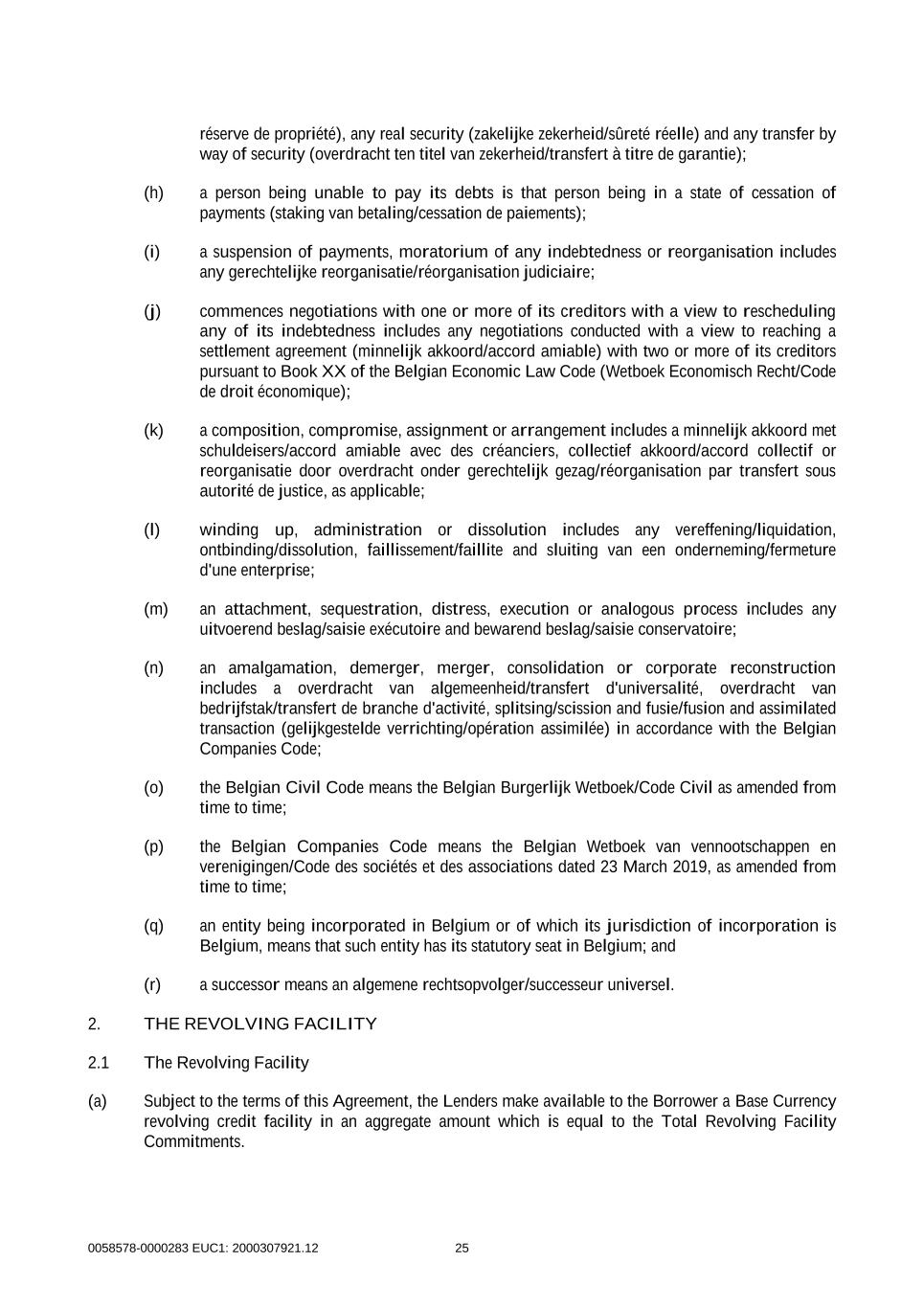 0058578-0000283 EUC1: 2000307921.12 25 réserve de propriété), any real security (zakelijke zekerheid/sûreté réelle) and any transfer by way of security (overdracht ten titel van zekerheid/transfert à titre de garantie); (h) a person being unable to pay its debts is that person being in a state of cessation of payments (staking van betaling/cessation de paiements); (i) a suspension of payments, moratorium of any indebtedness or reorganisation includes any gerechtelijke reorganisatie/réorganisation judiciaire; (j) commences negotiations with one or more of its creditors with a view to rescheduling any of its indebtedness includes any negotiations conducted with a view to reaching a settlement agreement (minnelijk akkoord/accord amiable) with two or more of its creditors pursuant to Book XX of the Belgian Economic Law Code (Wetboek Economisch Recht/Code de droit économique); (k) a composition, compromise, assignment or arrangement includes a minnelijk akkoord met schuldeisers/accord amiable avec des créanciers, collectief akkoord/accord collectif or reorganisatie door overdracht onder gerechtelijk gezag/réorganisation par transfert sous autorité de justice, as applicable; (l) winding up, administration or dissolution includes any vereffening/liquidation, ontbinding/dissolution, faillissement/faillite and sluiting van een onderneming/fermeture d'une enterprise; (m) an attachment, sequestration, distress, execution or analogous process includes any uitvoerend beslag/saisie exécutoire and bewarend beslag/saisie conservatoire; (n) an amalgamation, demerger, merger, consolidation or corporate reconstruction includes a overdracht van algemeenheid/transfert d'universalité, overdracht van bedrijfstak/transfert de branche d'activité, splitsing/scission and fusie/fusion and assimilated transaction (gelijkgestelde verrichting/opération assimilée) in accordance with the Belgian Companies Code; (o) the Belgian Civil Code means the Belgian Burgerlijk Wetboek/Code Civil as amended from time to time; (p) the Belgian Companies Code means the Belgian Wetboek van vennootschappen en verenigingen/Code des sociétés et des associations dated 23 March 2019, as amended from time to time; (q) an entity being incorporated in Belgium or of which its jurisdiction of incorporation is Belgium, means that such entity has its statutory seat in Belgium; and (r) a successor means an algemene rechtsopvolger/successeur universel. 2. THE REVOLVING FACILITY 2.1 The Revolving Facility (a) Subject to the terms of this Agreement, the Lenders make available to the Borrower a Base Currency revolving credit facility in an aggregate amount which is equal to the Total Revolving Facility Commitments.