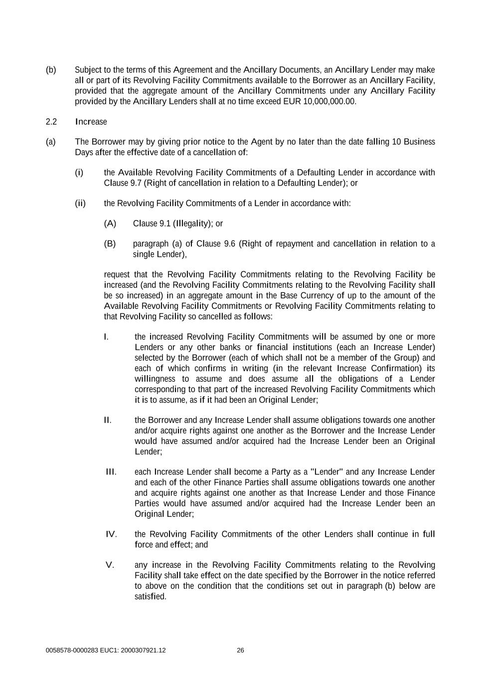 0058578-0000283 EUC1: 2000307921.12 26 (b) Subject to the terms of this Agreement and the Ancillary Documents, an Ancillary Lender may make all or part of its Revolving Facility Commitments available to the Borrower as an Ancillary Facility, provided that the aggregate amount of the Ancillary Commitments under any Ancillary Facility provided by the Ancillary Lenders shall at no time exceed EUR 10,000,000.00. 2.2 Increase (a) The Borrower may by giving prior notice to the Agent by no later than the date falling 10 Business Days after the effective date of a cancellation of: (i) the Available Revolving Facility Commitments of a Defaulting Lender in accordance with Clause 9.7 (Right of cancellation in relation to a Defaulting Lender); or (ii) the Revolving Facility Commitments of a Lender in accordance with: (A) Clause 9.1 (Illegality); or (B) paragraph (a) of Clause 9.6 (Right of repayment and cancellation in relation to a single Lender), request that the Revolving Facility Commitments relating to the Revolving Facility be increased (and the Revolving Facility Commitments relating to the Revolving Facility shall be so increased) in an aggregate amount in the Base Currency of up to the amount of the Available Revolving Facility Commitments or Revolving Facility Commitments relating to that Revolving Facility so cancelled as follows: I. the increased Revolving Facility Commitments will be assumed by one or more Lenders or any other banks or financial institutions (each an Increase Lender) selected by the Borrower (each of which shall not be a member of the Group) and each of which confirms in writing (in the relevant Increase Confirmation) its willingness to assume and does assume all the obligations of a Lender corresponding to that part of the increased Revolving Facility Commitments which it is to assume, as if it had been an Original Lender; II. the Borrower and any Increase Lender shall assume obligations towards one another and/or acquire rights against one another as the Borrower and the Increase Lender would have assumed and/or acquired had the Increase Lender been an Original Lender; III. each Increase Lender shall become a Party as a "Lender" and any Increase Lender and each of the other Finance Parties shall assume obligations towards one another and acquire rights against one another as that Increase Lender and those Finance Parties would have assumed and/or acquired had the Increase Lender been an Original Lender; IV. the Revolving Facility Commitments of the other Lenders shall continue in full force and effect; and V. any increase in the Revolving Facility Commitments relating to the Revolving Facility shall take effect on the date specified by the Borrower in the notice referred to above on the condition that the conditions set out in paragraph (b) below are satisfied.