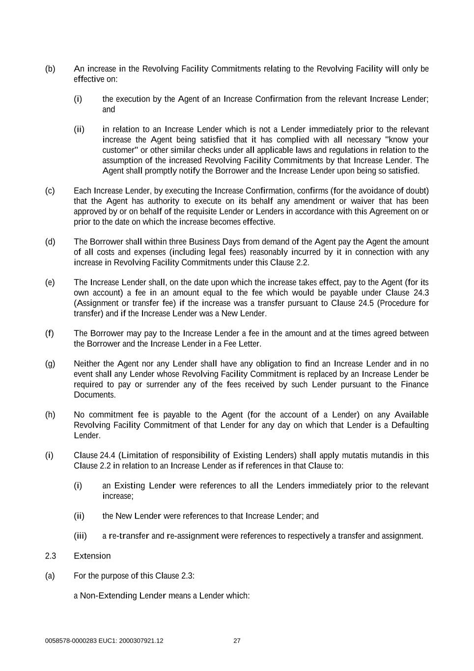 0058578-0000283 EUC1: 2000307921.12 27 (b) An increase in the Revolving Facility Commitments relating to the Revolving Facility will only be effective on: (i) the execution by the Agent of an Increase Confirmation from the relevant Increase Lender; and (ii) in relation to an Increase Lender which is not a Lender immediately prior to the relevant increase the Agent being satisfied that it has complied with all necessary "know your customer" or other similar checks under all applicable laws and regulations in relation to the assumption of the increased Revolving Facility Commitments by that Increase Lender. The Agent shall promptly notify the Borrower and the Increase Lender upon being so satisfied. (c) Each Increase Lender, by executing the Increase Confirmation, confirms (for the avoidance of doubt) that the Agent has authority to execute on its behalf any amendment or waiver that has been approved by or on behalf of the requisite Lender or Lenders in accordance with this Agreement on or prior to the date on which the increase becomes effective. (d) The Borrower shall within three Business Days from demand of the Agent pay the Agent the amount of all costs and expenses (including legal fees) reasonably incurred by it in connection with any increase in Revolving Facility Commitments under this Clause 2.2. (e) The Increase Lender shall, on the date upon which the increase takes effect, pay to the Agent (for its own account) a fee in an amount equal to the fee which would be payable under Clause 24.3 (Assignment or transfer fee) if the increase was a transfer pursuant to Clause 24.5 (Procedure for transfer) and if the Increase Lender was a New Lender. (f) The Borrower may pay to the Increase Lender a fee in the amount and at the times agreed between the Borrower and the Increase Lender in a Fee Letter. (g) Neither the Agent nor any Lender shall have any obligation to find an Increase Lender and in no event shall any Lender whose Revolving Facility Commitment is replaced by an Increase Lender be required to pay or surrender any of the fees received by such Lender pursuant to the Finance Documents. (h) No commitment fee is payable to the Agent (for the account of a Lender) on any Available Revolving Facility Commitment of that Lender for any day on which that Lender is a Defaulting Lender. (i) Clause 24.4 (Limitation of responsibility of Existing Lenders) shall apply mutatis mutandis in this Clause 2.2 in relation to an Increase Lender as if references in that Clause to: (i) an Existing Lender were references to all the Lenders immediately prior to the relevant increase; (ii) the New Lender were references to that Increase Lender; and (iii) a re-transfer and re-assignment were references to respectively a transfer and assignment. 2.3 Extension (a) For the purpose of this Clause 2.3: a Non-Extending Lender means a Lender which: