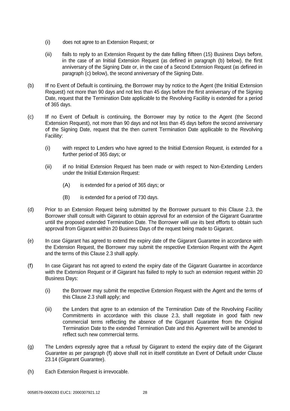 0058578-0000283 EUC1: 2000307921.12 28 (i) does not agree to an Extension Request; or (ii) fails to reply to an Extension Request by the date falling fifteen (15) Business Days before, in the case of an Initial Extension Request (as defined in paragraph (b) below), the first anniversary of the Signing Date or, in the case of a Second Extension Request (as defined in paragraph (c) below), the second anniversary of the Signing Date. (b) If no Event of Default is continuing, the Borrower may by notice to the Agent (the Initial Extension Request) not more than 90 days and not less than 45 days before the first anniversary of the Signing Date, request that the Termination Date applicable to the Revolving Facility is extended for a period of 365 days. (c) If no Event of Default is continuing, the Borrower may by notice to the Agent (the Second Extension Request), not more than 90 days and not less than 45 days before the second anniversary of the Signing Date, request that the then current Termination Date applicable to the Revolving Facility: (i) with respect to Lenders who have agreed to the Initial Extension Request, is extended for a further period of 365 days; or (ii) if no Initial Extension Request has been made or with respect to Non-Extending Lenders under the Initial Extension Request: (A) is extended for a period of 365 days; or (B) is extended for a period of 730 days. (d) Prior to an Extension Request being submitted by the Borrower pursuant to this Clause 2.3, the Borrower shall consult with Gigarant to obtain approval for an extension of the Gigarant Guarantee until the proposed extended Termination Date. The Borrower will use its best efforts to obtain such approval from Gigarant within 20 Business Days of the request being made to Gigarant. (e) In case Gigarant has agreed to extend the expiry date of the Gigarant Guarantee in accordance with the Extension Request, the Borrower may submit the respective Extension Request with the Agent and the terms of this Clause 2.3 shall apply. (f) In case Gigarant has not agreed to extend the expiry date of the Gigarant Guarantee in accordance with the Extension Request or if Gigarant has failed to reply to such an extension request within 20 Business Days: (i) the Borrower may submit the respective Extension Request with the Agent and the terms of this Clause 2.3 shall apply; and (ii) the Lenders that agree to an extension of the Termination Date of the Revolving Facility Commitments in accordance with this clause 2.3, shall negotiate in good faith new commercial terms reflecting the absence of the Gigarant Guarantee from the Original Termination Date to the extended Termination Date and this Agreement will be amended to reflect such new commercial terms. (g) The Lenders expressly agree that a refusal by Gigarant to extend the expiry date of the Gigarant Guarantee as per paragraph (f) above shall not in itself constitute an Event of Default under Clause 23.14 (Gigarant Guarantee). (h) Each Extension Request is irrevocable.