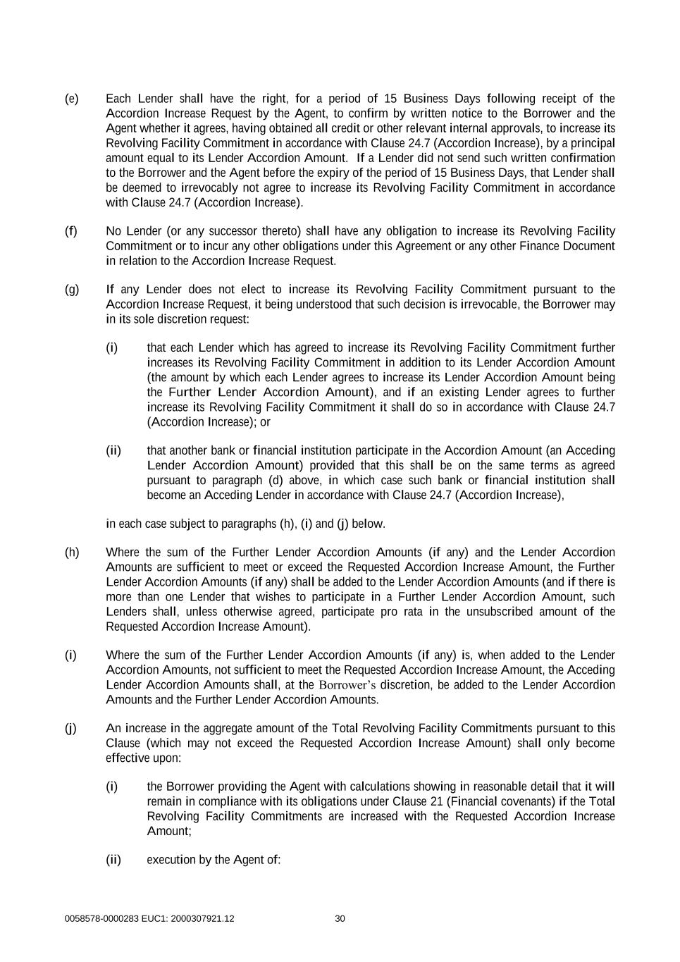 0058578-0000283 EUC1: 2000307921.12 30 (e) Each Lender shall have the right, for a period of 15 Business Days following receipt of the Accordion Increase Request by the Agent, to confirm by written notice to the Borrower and the Agent whether it agrees, having obtained all credit or other relevant internal approvals, to increase its Revolving Facility Commitment in accordance with Clause 24.7 (Accordion Increase), by a principal amount equal to its Lender Accordion Amount. If a Lender did not send such written confirmation to the Borrower and the Agent before the expiry of the period of 15 Business Days, that Lender shall be deemed to irrevocably not agree to increase its Revolving Facility Commitment in accordance with Clause 24.7 (Accordion Increase). (f) No Lender (or any successor thereto) shall have any obligation to increase its Revolving Facility Commitment or to incur any other obligations under this Agreement or any other Finance Document in relation to the Accordion Increase Request. (g) If any Lender does not elect to increase its Revolving Facility Commitment pursuant to the Accordion Increase Request, it being understood that such decision is irrevocable, the Borrower may in its sole discretion request: (i) that each Lender which has agreed to increase its Revolving Facility Commitment further increases its Revolving Facility Commitment in addition to its Lender Accordion Amount (the amount by which each Lender agrees to increase its Lender Accordion Amount being the Further Lender Accordion Amount), and if an existing Lender agrees to further increase its Revolving Facility Commitment it shall do so in accordance with Clause 24.7 (Accordion Increase); or (ii) that another bank or financial institution participate in the Accordion Amount (an Acceding Lender Accordion Amount) provided that this shall be on the same terms as agreed pursuant to paragraph (d) above, in which case such bank or financial institution shall become an Acceding Lender in accordance with Clause 24.7 (Accordion Increase), in each case subject to paragraphs (h), (i) and (j) below. (h) Where the sum of the Further Lender Accordion Amounts (if any) and the Lender Accordion Amounts are sufficient to meet or exceed the Requested Accordion Increase Amount, the Further Lender Accordion Amounts (if any) shall be added to the Lender Accordion Amounts (and if there is more than one Lender that wishes to participate in a Further Lender Accordion Amount, such Lenders shall, unless otherwise agreed, participate pro rata in the unsubscribed amount of the Requested Accordion Increase Amount). (i) Where the sum of the Further Lender Accordion Amounts (if any) is, when added to the Lender Accordion Amounts, not sufficient to meet the Requested Accordion Increase Amount, the Acceding Lender Accordion Amounts shall, at the Borrower’s discretion, be added to the Lender Accordion Amounts and the Further Lender Accordion Amounts. (j) An increase in the aggregate amount of the Total Revolving Facility Commitments pursuant to this Clause (which may not exceed the Requested Accordion Increase Amount) shall only become effective upon: (i) the Borrower providing the Agent with calculations showing in reasonable detail that it will remain in compliance with its obligations under Clause 21 (Financial covenants) if the Total Revolving Facility Commitments are increased with the Requested Accordion Increase Amount; (ii) execution by the Agent of:
