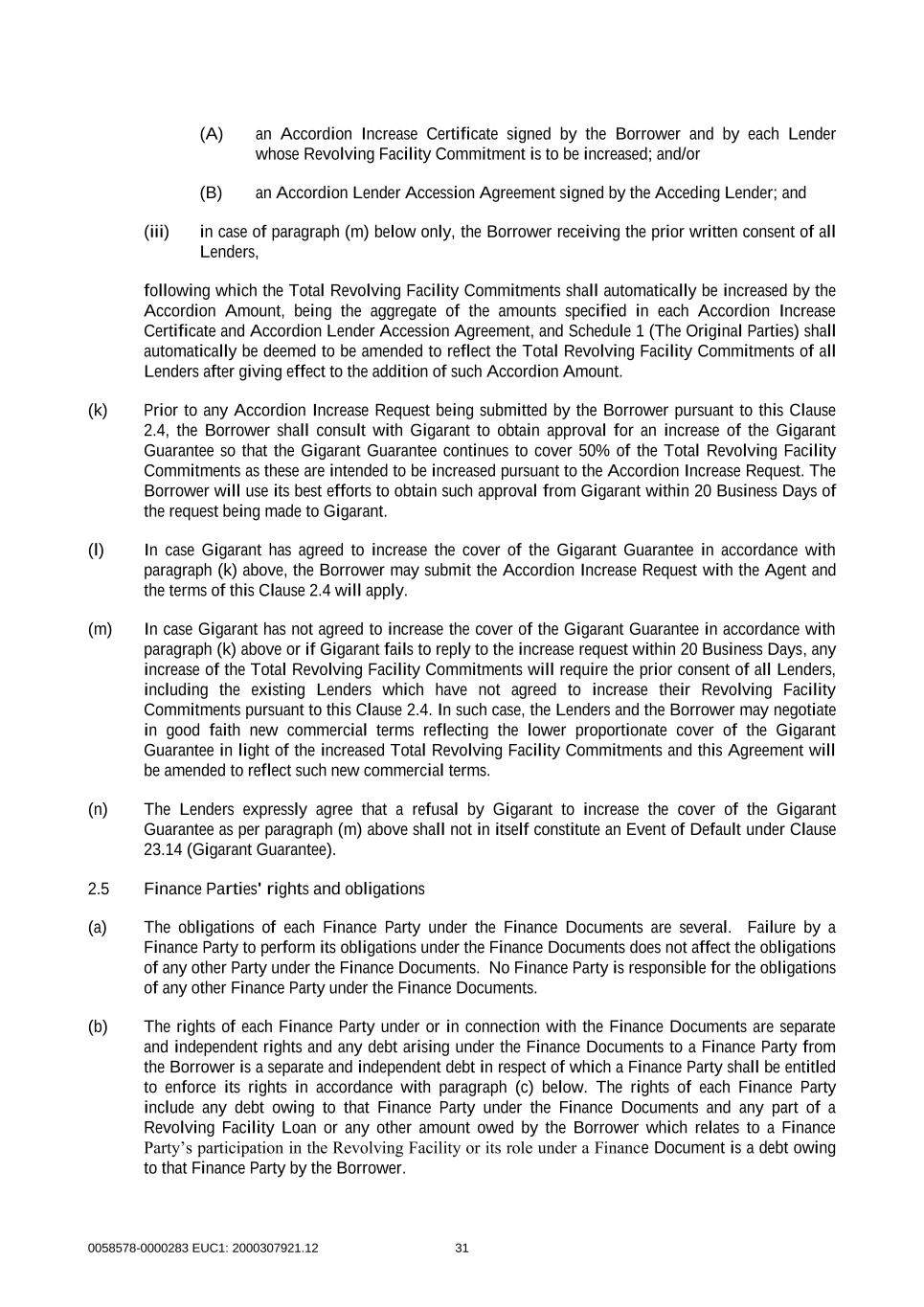 0058578-0000283 EUC1: 2000307921.12 31 (A) an Accordion Increase Certificate signed by the Borrower and by each Lender whose Revolving Facility Commitment is to be increased; and/or (B) an Accordion Lender Accession Agreement signed by the Acceding Lender; and (iii) in case of paragraph (m) below only, the Borrower receiving the prior written consent of all Lenders, following which the Total Revolving Facility Commitments shall automatically be increased by the Accordion Amount, being the aggregate of the amounts specified in each Accordion Increase Certificate and Accordion Lender Accession Agreement, and Schedule 1 (The Original Parties) shall automatically be deemed to be amended to reflect the Total Revolving Facility Commitments of all Lenders after giving effect to the addition of such Accordion Amount. (k) Prior to any Accordion Increase Request being submitted by the Borrower pursuant to this Clause 2.4, the Borrower shall consult with Gigarant to obtain approval for an increase of the Gigarant Guarantee so that the Gigarant Guarantee continues to cover 50% of the Total Revolving Facility Commitments as these are intended to be increased pursuant to the Accordion Increase Request. The Borrower will use its best efforts to obtain such approval from Gigarant within 20 Business Days of the request being made to Gigarant. (l) In case Gigarant has agreed to increase the cover of the Gigarant Guarantee in accordance with paragraph (k) above, the Borrower may submit the Accordion Increase Request with the Agent and the terms of this Clause 2.4 will apply. (m) In case Gigarant has not agreed to increase the cover of the Gigarant Guarantee in accordance with paragraph (k) above or if Gigarant fails to reply to the increase request within 20 Business Days, any increase of the Total Revolving Facility Commitments will require the prior consent of all Lenders, including the existing Lenders which have not agreed to increase their Revolving Facility Commitments pursuant to this Clause 2.4. In such case, the Lenders and the Borrower may negotiate in good faith new commercial terms reflecting the lower proportionate cover of the Gigarant Guarantee in light of the increased Total Revolving Facility Commitments and this Agreement will be amended to reflect such new commercial terms. (n) The Lenders expressly agree that a refusal by Gigarant to increase the cover of the Gigarant Guarantee as per paragraph (m) above shall not in itself constitute an Event of Default under Clause 23.14 (Gigarant Guarantee). 2.5 Finance Parties' rights and obligations (a) The obligations of each Finance Party under the Finance Documents are several. Failure by a Finance Party to perform its obligations under the Finance Documents does not affect the obligations of any other Party under the Finance Documents. No Finance Party is responsible for the obligations of any other Finance Party under the Finance Documents. (b) The rights of each Finance Party under or in connection with the Finance Documents are separate and independent rights and any debt arising under the Finance Documents to a Finance Party from the Borrower is a separate and independent debt in respect of which a Finance Party shall be entitled to enforce its rights in accordance with paragraph (c) below. The rights of each Finance Party include any debt owing to that Finance Party under the Finance Documents and any part of a Revolving Facility Loan or any other amount owed by the Borrower which relates to a Finance Party’s participation in the Revolving Facility or its role under a Finance Document is a debt owing to that Finance Party by the Borrower.