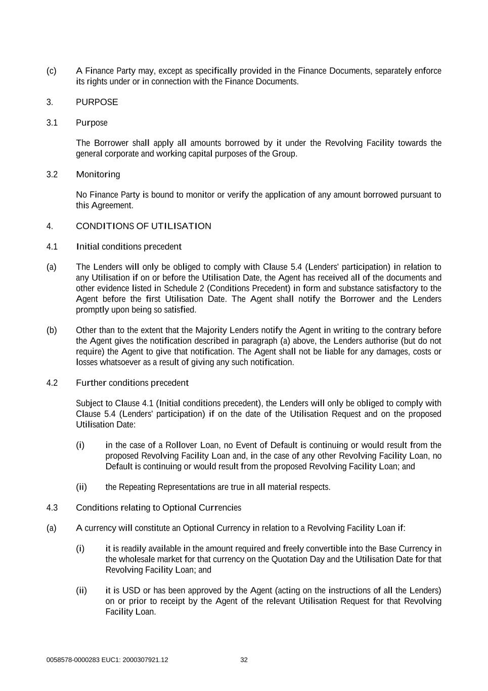 0058578-0000283 EUC1: 2000307921.12 32 (c) A Finance Party may, except as specifically provided in the Finance Documents, separately enforce its rights under or in connection with the Finance Documents. 3. PURPOSE 3.1 Purpose The Borrower shall apply all amounts borrowed by it under the Revolving Facility towards the general corporate and working capital purposes of the Group. 3.2 Monitoring No Finance Party is bound to monitor or verify the application of any amount borrowed pursuant to this Agreement. 4. CONDITIONS OF UTILISATION 4.1 Initial conditions precedent (a) The Lenders will only be obliged to comply with Clause 5.4 (Lenders' participation) in relation to any Utilisation if on or before the Utilisation Date, the Agent has received all of the documents and other evidence listed in Schedule 2 (Conditions Precedent) in form and substance satisfactory to the Agent before the first Utilisation Date. The Agent shall notify the Borrower and the Lenders promptly upon being so satisfied. (b) Other than to the extent that the Majority Lenders notify the Agent in writing to the contrary before the Agent gives the notification described in paragraph (a) above, the Lenders authorise (but do not require) the Agent to give that notification. The Agent shall not be liable for any damages, costs or losses whatsoever as a result of giving any such notification. 4.2 Further conditions precedent Subject to Clause 4.1 (Initial conditions precedent), the Lenders will only be obliged to comply with Clause 5.4 (Lenders' participation) if on the date of the Utilisation Request and on the proposed Utilisation Date: (i) in the case of a Rollover Loan, no Event of Default is continuing or would result from the proposed Revolving Facility Loan and, in the case of any other Revolving Facility Loan, no Default is continuing or would result from the proposed Revolving Facility Loan; and (ii) the Repeating Representations are true in all material respects. 4.3 Conditions relating to Optional Currencies (a) A currency will constitute an Optional Currency in relation to a Revolving Facility Loan if: (i) it is readily available in the amount required and freely convertible into the Base Currency in the wholesale market for that currency on the Quotation Day and the Utilisation Date for that Revolving Facility Loan; and (ii) it is USD or has been approved by the Agent (acting on the instructions of all the Lenders) on or prior to receipt by the Agent of the relevant Utilisation Request for that Revolving Facility Loan.