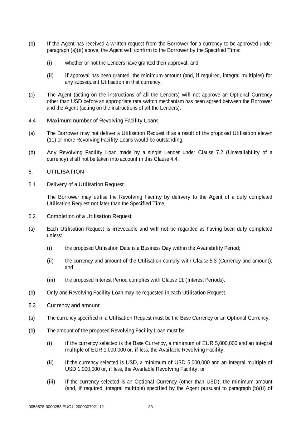 0058578-0000283 EUC1: 2000307921.12 33 (b) If the Agent has received a written request from the Borrower for a currency to be approved under paragraph (a)(ii) above, the Agent will confirm to the Borrower by the Specified Time: (i) whether or not the Lenders have granted their approval; and (ii) if approval has been granted, the minimum amount (and, if required, integral multiples) for any subsequent Utilisation in that currency. (c) The Agent (acting on the instructions of all the Lenders) will not approve an Optional Currency other than USD before an appropriate rate switch mechanism has been agreed between the Borrower and the Agent (acting on the instructions of all the Lenders). 4.4 Maximum number of Revolving Facility Loans (a) The Borrower may not deliver a Utilisation Request if as a result of the proposed Utilisation eleven (11) or more Revolving Facility Loans would be outstanding. (b) Any Revolving Facility Loan made by a single Lender under Clause 7.2 (Unavailability of a currency) shall not be taken into account in this Clause 4.4. 5. UTILISATION 5.1 Delivery of a Utilisation Request The Borrower may utilise the Revolving Facility by delivery to the Agent of a duly completed Utilisation Request not later than the Specified Time. 5.2 Completion of a Utilisation Request (a) Each Utilisation Request is irrevocable and will not be regarded as having been duly completed unless: (i) the proposed Utilisation Date is a Business Day within the Availability Period; (ii) the currency and amount of the Utilisation comply with Clause 5.3 (Currency and amount); and (iii) the proposed Interest Period complies with Clause 11 (Interest Periods). (b) Only one Revolving Facility Loan may be requested in each Utilisation Request. 5.3 Currency and amount (a) The currency specified in a Utilisation Request must be the Base Currency or an Optional Currency. (b) The amount of the proposed Revolving Facility Loan must be: (i) if the currency selected is the Base Currency, a minimum of EUR 5,000,000 and an integral multiple of EUR 1,000,000 or, if less, the Available Revolving Facility; (ii) if the currency selected is USD, a minimum of USD 5,000,000 and an integral multiple of USD 1,000,000 or, if less, the Available Revolving Facility; or (iii) if the currency selected is an Optional Currency (other than USD), the minimum amount (and, if required, integral multiple) specified by the Agent pursuant to paragraph (b)(ii) of
