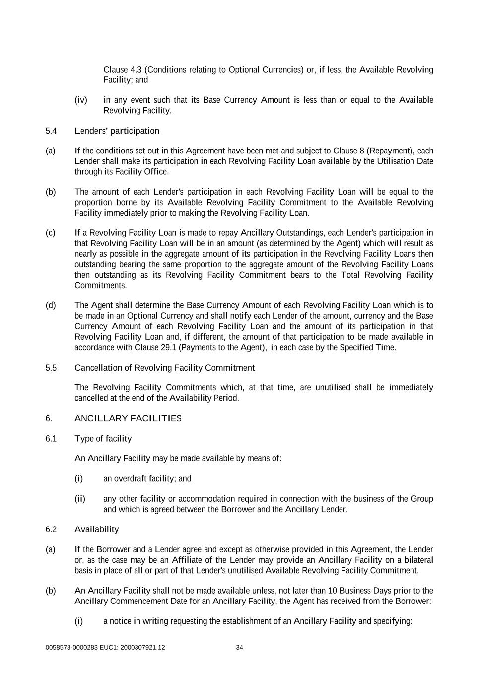 0058578-0000283 EUC1: 2000307921.12 34 Clause 4.3 (Conditions relating to Optional Currencies) or, if less, the Available Revolving Facility; and (iv) in any event such that its Base Currency Amount is less than or equal to the Available Revolving Facility. 5.4 Lenders' participation (a) If the conditions set out in this Agreement have been met and subject to Clause 8 (Repayment), each Lender shall make its participation in each Revolving Facility Loan available by the Utilisation Date through its Facility Office. (b) The amount of each Lender's participation in each Revolving Facility Loan will be equal to the proportion borne by its Available Revolving Facility Commitment to the Available Revolving Facility immediately prior to making the Revolving Facility Loan. (c) If a Revolving Facility Loan is made to repay Ancillary Outstandings, each Lender's participation in that Revolving Facility Loan will be in an amount (as determined by the Agent) which will result as nearly as possible in the aggregate amount of its participation in the Revolving Facility Loans then outstanding bearing the same proportion to the aggregate amount of the Revolving Facility Loans then outstanding as its Revolving Facility Commitment bears to the Total Revolving Facility Commitments. (d) The Agent shall determine the Base Currency Amount of each Revolving Facility Loan which is to be made in an Optional Currency and shall notify each Lender of the amount, currency and the Base Currency Amount of each Revolving Facility Loan and the amount of its participation in that Revolving Facility Loan and, if different, the amount of that participation to be made available in accordance with Clause 29.1 (Payments to the Agent), in each case by the Specified Time. 5.5 Cancellation of Revolving Facility Commitment The Revolving Facility Commitments which, at that time, are unutilised shall be immediately cancelled at the end of the Availability Period. 6. ANCILLARY FACILITIES 6.1 Type of facility An Ancillary Facility may be made available by means of: (i) an overdraft facility; and (ii) any other facility or accommodation required in connection with the business of the Group and which is agreed between the Borrower and the Ancillary Lender. 6.2 Availability (a) If the Borrower and a Lender agree and except as otherwise provided in this Agreement, the Lender or, as the case may be an Affiliate of the Lender may provide an Ancillary Facility on a bilateral basis in place of all or part of that Lender's unutilised Available Revolving Facility Commitment. (b) An Ancillary Facility shall not be made available unless, not later than 10 Business Days prior to the Ancillary Commencement Date for an Ancillary Facility, the Agent has received from the Borrower: (i) a notice in writing requesting the establishment of an Ancillary Facility and specifying: