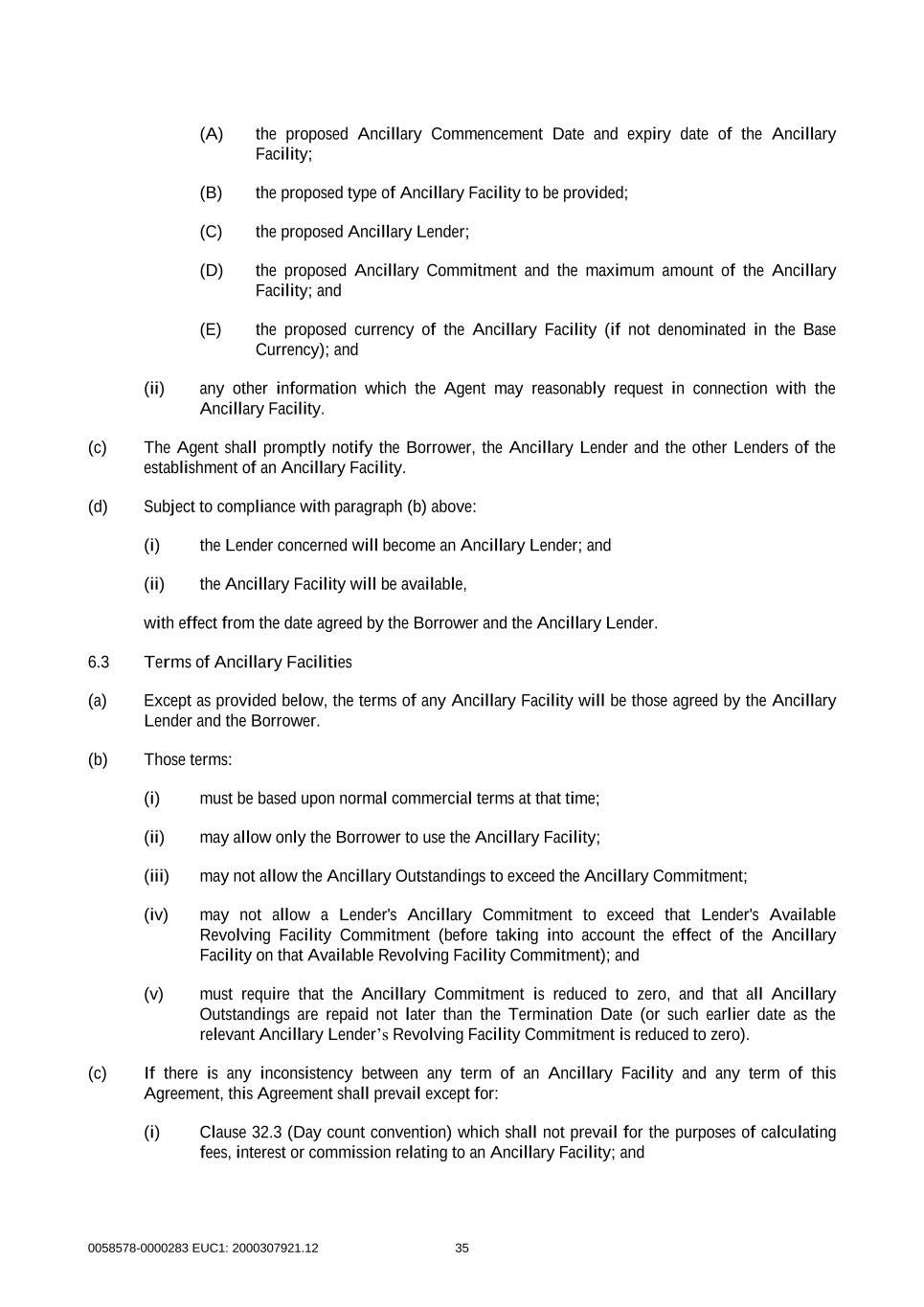 0058578-0000283 EUC1: 2000307921.12 35 (A) the proposed Ancillary Commencement Date and expiry date of the Ancillary Facility; (B) the proposed type of Ancillary Facility to be provided; (C) the proposed Ancillary Lender; (D) the proposed Ancillary Commitment and the maximum amount of the Ancillary Facility; and (E) the proposed currency of the Ancillary Facility (if not denominated in the Base Currency); and (ii) any other information which the Agent may reasonably request in connection with the Ancillary Facility. (c) The Agent shall promptly notify the Borrower, the Ancillary Lender and the other Lenders of the establishment of an Ancillary Facility. (d) Subject to compliance with paragraph (b) above: (i) the Lender concerned will become an Ancillary Lender; and (ii) the Ancillary Facility will be available, with effect from the date agreed by the Borrower and the Ancillary Lender. 6.3 Terms of Ancillary Facilities (a) Except as provided below, the terms of any Ancillary Facility will be those agreed by the Ancillary Lender and the Borrower. (b) Those terms: (i) must be based upon normal commercial terms at that time; (ii) may allow only the Borrower to use the Ancillary Facility; (iii) may not allow the Ancillary Outstandings to exceed the Ancillary Commitment; (iv) may not allow a Lender's Ancillary Commitment to exceed that Lender's Available Revolving Facility Commitment (before taking into account the effect of the Ancillary Facility on that Available Revolving Facility Commitment); and (v) must require that the Ancillary Commitment is reduced to zero, and that all Ancillary Outstandings are repaid not later than the Termination Date (or such earlier date as the relevant Ancillary Lender’s Revolving Facility Commitment is reduced to zero). (c) If there is any inconsistency between any term of an Ancillary Facility and any term of this Agreement, this Agreement shall prevail except for: (i) Clause 32.3 (Day count convention) which shall not prevail for the purposes of calculating fees, interest or commission relating to an Ancillary Facility; and