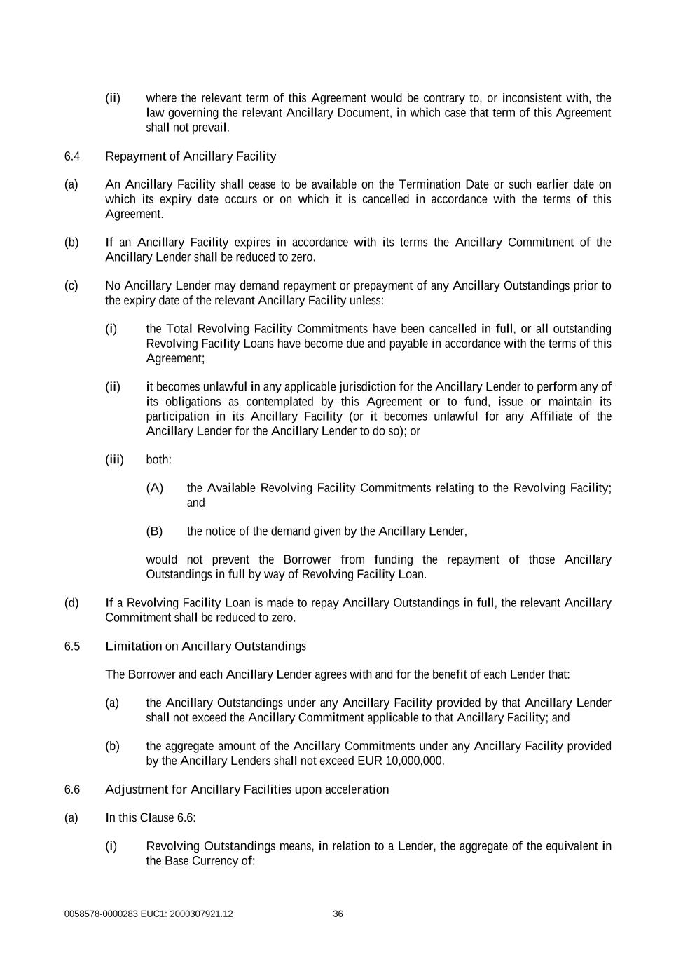 0058578-0000283 EUC1: 2000307921.12 36 (ii) where the relevant term of this Agreement would be contrary to, or inconsistent with, the law governing the relevant Ancillary Document, in which case that term of this Agreement shall not prevail. 6.4 Repayment of Ancillary Facility (a) An Ancillary Facility shall cease to be available on the Termination Date or such earlier date on which its expiry date occurs or on which it is cancelled in accordance with the terms of this Agreement. (b) If an Ancillary Facility expires in accordance with its terms the Ancillary Commitment of the Ancillary Lender shall be reduced to zero. (c) No Ancillary Lender may demand repayment or prepayment of any Ancillary Outstandings prior to the expiry date of the relevant Ancillary Facility unless: (i) the Total Revolving Facility Commitments have been cancelled in full, or all outstanding Revolving Facility Loans have become due and payable in accordance with the terms of this Agreement; (ii) it becomes unlawful in any applicable jurisdiction for the Ancillary Lender to perform any of its obligations as contemplated by this Agreement or to fund, issue or maintain its participation in its Ancillary Facility (or it becomes unlawful for any Affiliate of the Ancillary Lender for the Ancillary Lender to do so); or (iii) both: (A) the Available Revolving Facility Commitments relating to the Revolving Facility; and (B) the notice of the demand given by the Ancillary Lender, would not prevent the Borrower from funding the repayment of those Ancillary Outstandings in full by way of Revolving Facility Loan. (d) If a Revolving Facility Loan is made to repay Ancillary Outstandings in full, the relevant Ancillary Commitment shall be reduced to zero. 6.5 Limitation on Ancillary Outstandings The Borrower and each Ancillary Lender agrees with and for the benefit of each Lender that: (a) the Ancillary Outstandings under any Ancillary Facility provided by that Ancillary Lender shall not exceed the Ancillary Commitment applicable to that Ancillary Facility; and (b) the aggregate amount of the Ancillary Commitments under any Ancillary Facility provided by the Ancillary Lenders shall not exceed EUR 10,000,000. 6.6 Adjustment for Ancillary Facilities upon acceleration (a) In this Clause 6.6: (i) Revolving Outstandings means, in relation to a Lender, the aggregate of the equivalent in the Base Currency of: