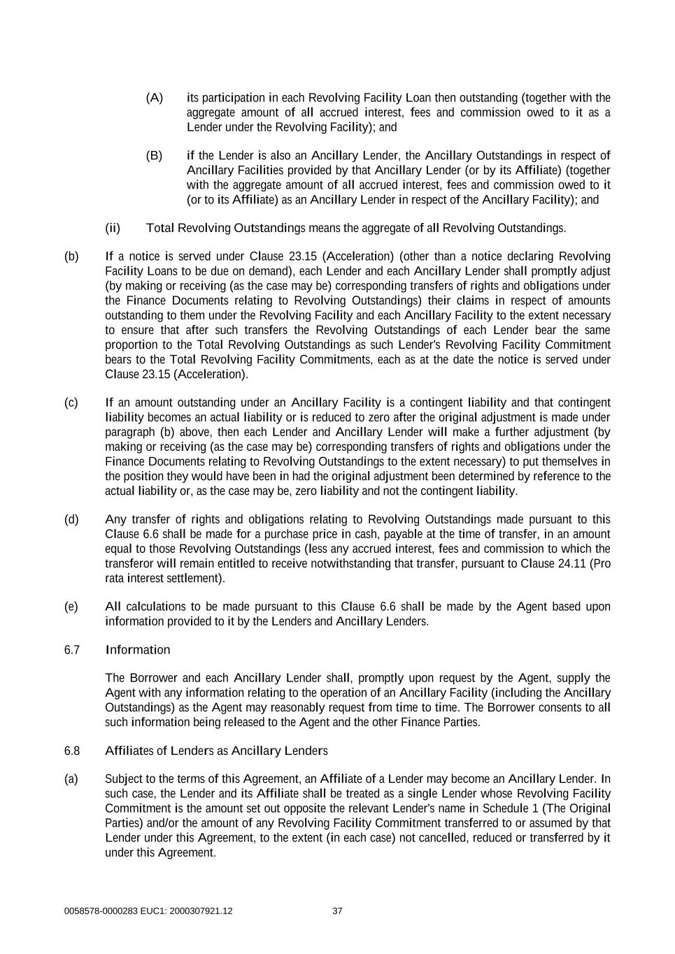 0058578-0000283 EUC1: 2000307921.12 37 (A) its participation in each Revolving Facility Loan then outstanding (together with the aggregate amount of all accrued interest, fees and commission owed to it as a Lender under the Revolving Facility); and (B) if the Lender is also an Ancillary Lender, the Ancillary Outstandings in respect of Ancillary Facilities provided by that Ancillary Lender (or by its Affiliate) (together with the aggregate amount of all accrued interest, fees and commission owed to it (or to its Affiliate) as an Ancillary Lender in respect of the Ancillary Facility); and (ii) Total Revolving Outstandings means the aggregate of all Revolving Outstandings. (b) If a notice is served under Clause 23.15 (Acceleration) (other than a notice declaring Revolving Facility Loans to be due on demand), each Lender and each Ancillary Lender shall promptly adjust (by making or receiving (as the case may be) corresponding transfers of rights and obligations under the Finance Documents relating to Revolving Outstandings) their claims in respect of amounts outstanding to them under the Revolving Facility and each Ancillary Facility to the extent necessary to ensure that after such transfers the Revolving Outstandings of each Lender bear the same proportion to the Total Revolving Outstandings as such Lender's Revolving Facility Commitment bears to the Total Revolving Facility Commitments, each as at the date the notice is served under Clause 23.15 (Acceleration). (c) If an amount outstanding under an Ancillary Facility is a contingent liability and that contingent liability becomes an actual liability or is reduced to zero after the original adjustment is made under paragraph (b) above, then each Lender and Ancillary Lender will make a further adjustment (by making or receiving (as the case may be) corresponding transfers of rights and obligations under the Finance Documents relating to Revolving Outstandings to the extent necessary) to put themselves in the position they would have been in had the original adjustment been determined by reference to the actual liability or, as the case may be, zero liability and not the contingent liability. (d) Any transfer of rights and obligations relating to Revolving Outstandings made pursuant to this Clause 6.6 shall be made for a purchase price in cash, payable at the time of transfer, in an amount equal to those Revolving Outstandings (less any accrued interest, fees and commission to which the transferor will remain entitled to receive notwithstanding that transfer, pursuant to Clause 24.11 (Pro rata interest settlement). (e) All calculations to be made pursuant to this Clause 6.6 shall be made by the Agent based upon information provided to it by the Lenders and Ancillary Lenders. 6.7 Information The Borrower and each Ancillary Lender shall, promptly upon request by the Agent, supply the Agent with any information relating to the operation of an Ancillary Facility (including the Ancillary Outstandings) as the Agent may reasonably request from time to time. The Borrower consents to all such information being released to the Agent and the other Finance Parties. 6.8 Affiliates of Lenders as Ancillary Lenders (a) Subject to the terms of this Agreement, an Affiliate of a Lender may become an Ancillary Lender. In such case, the Lender and its Affiliate shall be treated as a single Lender whose Revolving Facility Commitment is the amount set out opposite the relevant Lender's name in Schedule 1 (The Original Parties) and/or the amount of any Revolving Facility Commitment transferred to or assumed by that Lender under this Agreement, to the extent (in each case) not cancelled, reduced or transferred by it under this Agreement.