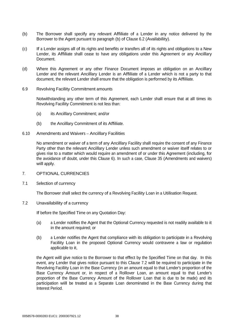 0058578-0000283 EUC1: 2000307921.12 38 (b) The Borrower shall specify any relevant Affiliate of a Lender in any notice delivered by the Borrower to the Agent pursuant to paragraph (b) of Clause 6.2 (Availability). (c) If a Lender assigns all of its rights and benefits or transfers all of its rights and obligations to a New Lender, its Affiliate shall cease to have any obligations under this Agreement or any Ancillary Document. (d) Where this Agreement or any other Finance Document imposes an obligation on an Ancillary Lender and the relevant Ancillary Lender is an Affiliate of a Lender which is not a party to that document, the relevant Lender shall ensure that the obligation is performed by its Affiliate. 6.9 Revolving Facility Commitment amounts Notwithstanding any other term of this Agreement, each Lender shall ensure that at all times its Revolving Facility Commitment is not less than: (a) its Ancillary Commitment; and/or (b) the Ancillary Commitment of its Affiliate. 6.10 Amendments and Waivers – Ancillary Facilities No amendment or waiver of a term of any Ancillary Facility shall require the consent of any Finance Party other than the relevant Ancillary Lender unless such amendment or waiver itself relates to or gives rise to a matter which would require an amendment of or under this Agreement (including, for the avoidance of doubt, under this Clause 6). In such a case, Clause 35 (Amendments and waivers) will apply. 7. OPTIONAL CURRENCIES 7.1 Selection of currency The Borrower shall select the currency of a Revolving Facility Loan in a Utilisation Request. 7.2 Unavailability of a currency If before the Specified Time on any Quotation Day: (a) a Lender notifies the Agent that the Optional Currency requested is not readily available to it in the amount required; or (b) a Lender notifies the Agent that compliance with its obligation to participate in a Revolving Facility Loan in the proposed Optional Currency would contravene a law or regulation applicable to it, the Agent will give notice to the Borrower to that effect by the Specified Time on that day. In this event, any Lender that gives notice pursuant to this Clause 7.2 will be required to participate in the Revolving Facility Loan in the Base Currency (in an amount equal to that Lender's proportion of the Base Currency Amount or, in respect of a Rollover Loan, an amount equal to that Lender's proportion of the Base Currency Amount of the Rollover Loan that is due to be made) and its participation will be treated as a Separate Loan denominated in the Base Currency during that Interest Period.