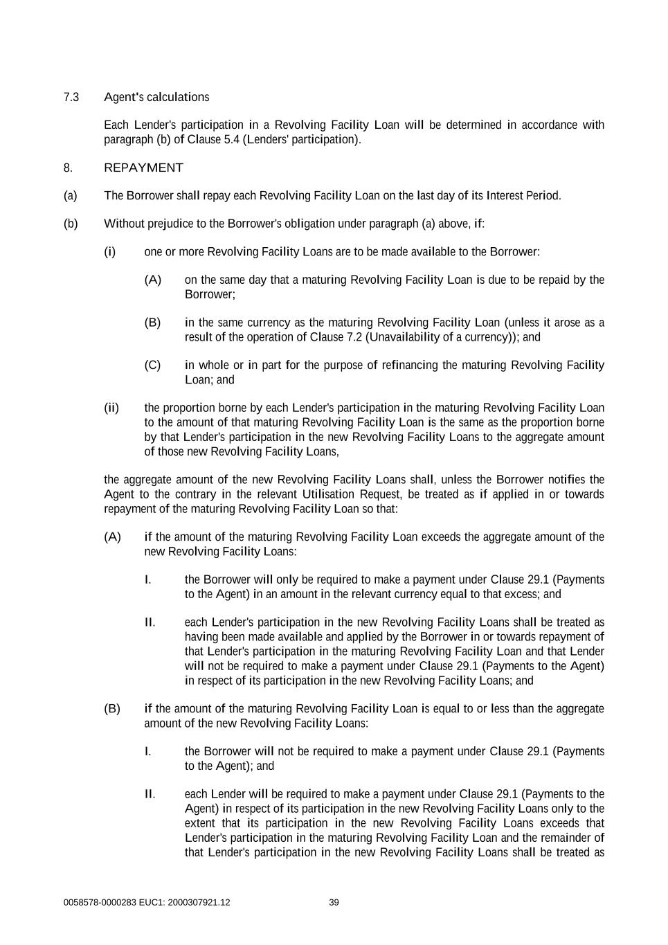 0058578-0000283 EUC1: 2000307921.12 39 7.3 Agent's calculations Each Lender's participation in a Revolving Facility Loan will be determined in accordance with paragraph (b) of Clause 5.4 (Lenders' participation). 8. REPAYMENT (a) The Borrower shall repay each Revolving Facility Loan on the last day of its Interest Period. (b) Without prejudice to the Borrower's obligation under paragraph (a) above, if: (i) one or more Revolving Facility Loans are to be made available to the Borrower: (A) on the same day that a maturing Revolving Facility Loan is due to be repaid by the Borrower; (B) in the same currency as the maturing Revolving Facility Loan (unless it arose as a result of the operation of Clause 7.2 (Unavailability of a currency)); and (C) in whole or in part for the purpose of refinancing the maturing Revolving Facility Loan; and (ii) the proportion borne by each Lender's participation in the maturing Revolving Facility Loan to the amount of that maturing Revolving Facility Loan is the same as the proportion borne by that Lender's participation in the new Revolving Facility Loans to the aggregate amount of those new Revolving Facility Loans, the aggregate amount of the new Revolving Facility Loans shall, unless the Borrower notifies the Agent to the contrary in the relevant Utilisation Request, be treated as if applied in or towards repayment of the maturing Revolving Facility Loan so that: (A) if the amount of the maturing Revolving Facility Loan exceeds the aggregate amount of the new Revolving Facility Loans: I. the Borrower will only be required to make a payment under Clause 29.1 (Payments to the Agent) in an amount in the relevant currency equal to that excess; and II. each Lender's participation in the new Revolving Facility Loans shall be treated as having been made available and applied by the Borrower in or towards repayment of that Lender's participation in the maturing Revolving Facility Loan and that Lender will not be required to make a payment under Clause 29.1 (Payments to the Agent) in respect of its participation in the new Revolving Facility Loans; and (B) if the amount of the maturing Revolving Facility Loan is equal to or less than the aggregate amount of the new Revolving Facility Loans: I. the Borrower will not be required to make a payment under Clause 29.1 (Payments to the Agent); and II. each Lender will be required to make a payment under Clause 29.1 (Payments to the Agent) in respect of its participation in the new Revolving Facility Loans only to the extent that its participation in the new Revolving Facility Loans exceeds that Lender's participation in the maturing Revolving Facility Loan and the remainder of that Lender's participation in the new Revolving Facility Loans shall be treated as