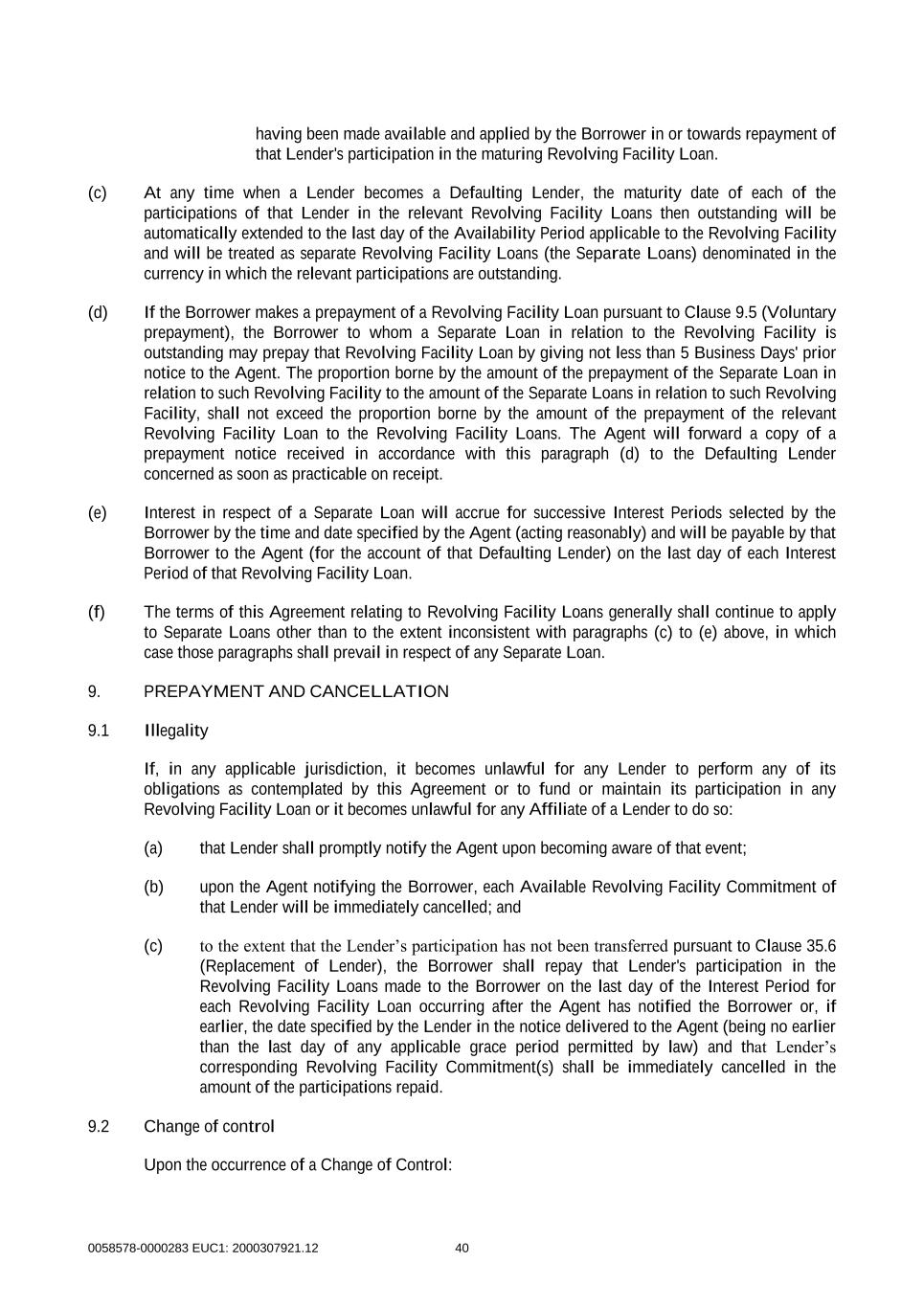 0058578-0000283 EUC1: 2000307921.12 40 having been made available and applied by the Borrower in or towards repayment of that Lender's participation in the maturing Revolving Facility Loan. (c) At any time when a Lender becomes a Defaulting Lender, the maturity date of each of the participations of that Lender in the relevant Revolving Facility Loans then outstanding will be automatically extended to the last day of the Availability Period applicable to the Revolving Facility and will be treated as separate Revolving Facility Loans (the Separate Loans) denominated in the currency in which the relevant participations are outstanding. (d) If the Borrower makes a prepayment of a Revolving Facility Loan pursuant to Clause 9.5 (Voluntary prepayment), the Borrower to whom a Separate Loan in relation to the Revolving Facility is outstanding may prepay that Revolving Facility Loan by giving not less than 5 Business Days' prior notice to the Agent. The proportion borne by the amount of the prepayment of the Separate Loan in relation to such Revolving Facility to the amount of the Separate Loans in relation to such Revolving Facility, shall not exceed the proportion borne by the amount of the prepayment of the relevant Revolving Facility Loan to the Revolving Facility Loans. The Agent will forward a copy of a prepayment notice received in accordance with this paragraph (d) to the Defaulting Lender concerned as soon as practicable on receipt. (e) Interest in respect of a Separate Loan will accrue for successive Interest Periods selected by the Borrower by the time and date specified by the Agent (acting reasonably) and will be payable by that Borrower to the Agent (for the account of that Defaulting Lender) on the last day of each Interest Period of that Revolving Facility Loan. (f) The terms of this Agreement relating to Revolving Facility Loans generally shall continue to apply to Separate Loans other than to the extent inconsistent with paragraphs (c) to (e) above, in which case those paragraphs shall prevail in respect of any Separate Loan. 9. PREPAYMENT AND CANCELLATION 9.1 Illegality If, in any applicable jurisdiction, it becomes unlawful for any Lender to perform any of its obligations as contemplated by this Agreement or to fund or maintain its participation in any Revolving Facility Loan or it becomes unlawful for any Affiliate of a Lender to do so: (a) that Lender shall promptly notify the Agent upon becoming aware of that event; (b) upon the Agent notifying the Borrower, each Available Revolving Facility Commitment of that Lender will be immediately cancelled; and (c) to the extent that the Lender’s participation has not been transferred pursuant to Clause 35.6 (Replacement of Lender), the Borrower shall repay that Lender's participation in the Revolving Facility Loans made to the Borrower on the last day of the Interest Period for each Revolving Facility Loan occurring after the Agent has notified the Borrower or, if earlier, the date specified by the Lender in the notice delivered to the Agent (being no earlier than the last day of any applicable grace period permitted by law) and that Lender’s corresponding Revolving Facility Commitment(s) shall be immediately cancelled in the amount of the participations repaid. 9.2 Change of control Upon the occurrence of a Change of Control: