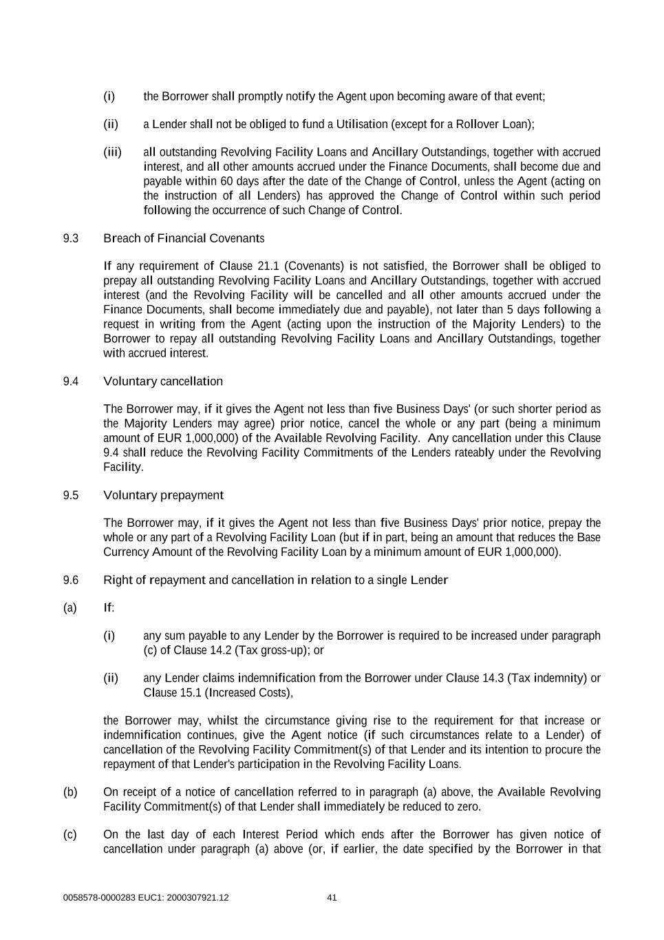0058578-0000283 EUC1: 2000307921.12 41 (i) the Borrower shall promptly notify the Agent upon becoming aware of that event; (ii) a Lender shall not be obliged to fund a Utilisation (except for a Rollover Loan); (iii) all outstanding Revolving Facility Loans and Ancillary Outstandings, together with accrued interest, and all other amounts accrued under the Finance Documents, shall become due and payable within 60 days after the date of the Change of Control, unless the Agent (acting on the instruction of all Lenders) has approved the Change of Control within such period following the occurrence of such Change of Control. 9.3 Breach of Financial Covenants If any requirement of Clause 21.1 (Covenants) is not satisfied, the Borrower shall be obliged to prepay all outstanding Revolving Facility Loans and Ancillary Outstandings, together with accrued interest (and the Revolving Facility will be cancelled and all other amounts accrued under the Finance Documents, shall become immediately due and payable), not later than 5 days following a request in writing from the Agent (acting upon the instruction of the Majority Lenders) to the Borrower to repay all outstanding Revolving Facility Loans and Ancillary Outstandings, together with accrued interest. 9.4 Voluntary cancellation The Borrower may, if it gives the Agent not less than five Business Days' (or such shorter period as the Majority Lenders may agree) prior notice, cancel the whole or any part (being a minimum amount of EUR 1,000,000) of the Available Revolving Facility. Any cancellation under this Clause 9.4 shall reduce the Revolving Facility Commitments of the Lenders rateably under the Revolving Facility. 9.5 Voluntary prepayment The Borrower may, if it gives the Agent not less than five Business Days' prior notice, prepay the whole or any part of a Revolving Facility Loan (but if in part, being an amount that reduces the Base Currency Amount of the Revolving Facility Loan by a minimum amount of EUR 1,000,000). 9.6 Right of repayment and cancellation in relation to a single Lender (a) If: (i) any sum payable to any Lender by the Borrower is required to be increased under paragraph (c) of Clause 14.2 (Tax gross-up); or (ii) any Lender claims indemnification from the Borrower under Clause 14.3 (Tax indemnity) or Clause 15.1 (Increased Costs), the Borrower may, whilst the circumstance giving rise to the requirement for that increase or indemnification continues, give the Agent notice (if such circumstances relate to a Lender) of cancellation of the Revolving Facility Commitment(s) of that Lender and its intention to procure the repayment of that Lender's participation in the Revolving Facility Loans. (b) On receipt of a notice of cancellation referred to in paragraph (a) above, the Available Revolving Facility Commitment(s) of that Lender shall immediately be reduced to zero. (c) On the last day of each Interest Period which ends after the Borrower has given notice of cancellation under paragraph (a) above (or, if earlier, the date specified by the Borrower in that
