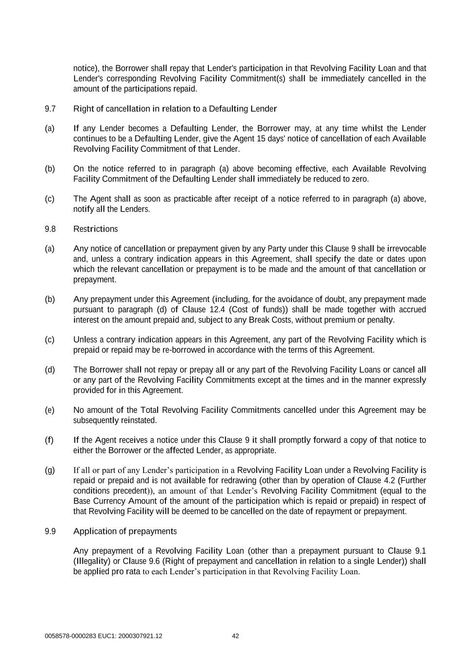 0058578-0000283 EUC1: 2000307921.12 42 notice), the Borrower shall repay that Lender's participation in that Revolving Facility Loan and that Lender's corresponding Revolving Facility Commitment(s) shall be immediately cancelled in the amount of the participations repaid. 9.7 Right of cancellation in relation to a Defaulting Lender (a) If any Lender becomes a Defaulting Lender, the Borrower may, at any time whilst the Lender continues to be a Defaulting Lender, give the Agent 15 days' notice of cancellation of each Available Revolving Facility Commitment of that Lender. (b) On the notice referred to in paragraph (a) above becoming effective, each Available Revolving Facility Commitment of the Defaulting Lender shall immediately be reduced to zero. (c) The Agent shall as soon as practicable after receipt of a notice referred to in paragraph (a) above, notify all the Lenders. 9.8 Restrictions (a) Any notice of cancellation or prepayment given by any Party under this Clause 9 shall be irrevocable and, unless a contrary indication appears in this Agreement, shall specify the date or dates upon which the relevant cancellation or prepayment is to be made and the amount of that cancellation or prepayment. (b) Any prepayment under this Agreement (including, for the avoidance of doubt, any prepayment made pursuant to paragraph (d) of Clause 12.4 (Cost of funds)) shall be made together with accrued interest on the amount prepaid and, subject to any Break Costs, without premium or penalty. (c) Unless a contrary indication appears in this Agreement, any part of the Revolving Facility which is prepaid or repaid may be re-borrowed in accordance with the terms of this Agreement. (d) The Borrower shall not repay or prepay all or any part of the Revolving Facility Loans or cancel all or any part of the Revolving Facility Commitments except at the times and in the manner expressly provided for in this Agreement. (e) No amount of the Total Revolving Facility Commitments cancelled under this Agreement may be subsequently reinstated. (f) If the Agent receives a notice under this Clause 9 it shall promptly forward a copy of that notice to either the Borrower or the affected Lender, as appropriate. (g) If all or part of any Lender’s participation in a Revolving Facility Loan under a Revolving Facility is repaid or prepaid and is not available for redrawing (other than by operation of Clause 4.2 (Further conditions precedent)), an amount of that Lender’s Revolving Facility Commitment (equal to the Base Currency Amount of the amount of the participation which is repaid or prepaid) in respect of that Revolving Facility will be deemed to be cancelled on the date of repayment or prepayment. 9.9 Application of prepayments Any prepayment of a Revolving Facility Loan (other than a prepayment pursuant to Clause 9.1 (Illegality) or Clause 9.6 (Right of prepayment and cancellation in relation to a single Lender)) shall be applied pro rata to each Lender’s participation in that Revolving Facility Loan.